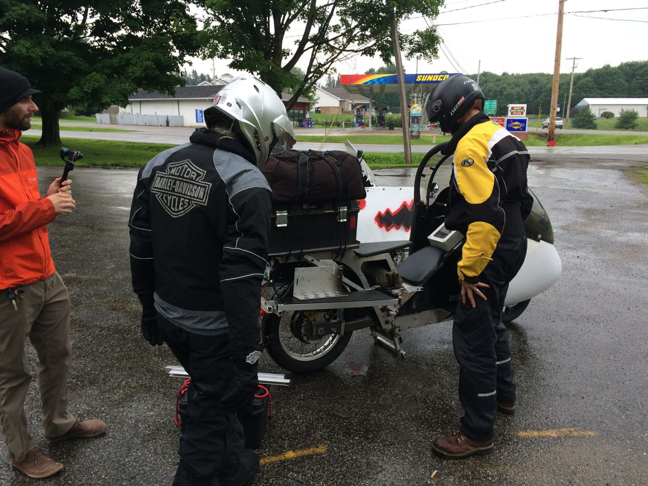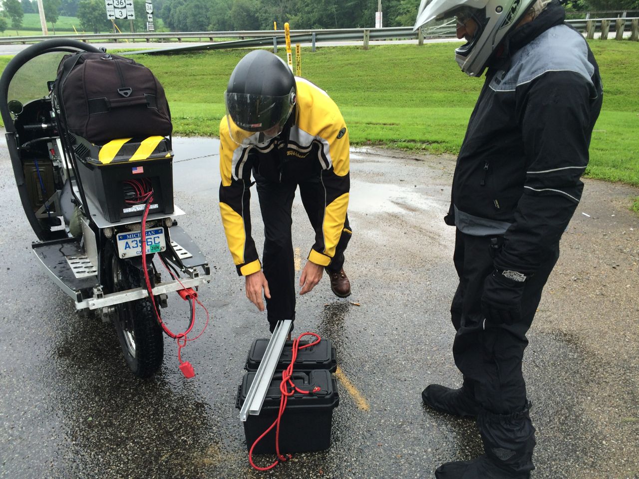 We noticed a car following us for a while. It turned out to be Burton in his Honda Element. He owns a Zero electric motorcycle, which he is currently modifying for aerodynamics, but wasn’t able to have it there for the event. Instead, he became our unofficial chase vehicle and did a little filming with his GoPro anytime we stopped.