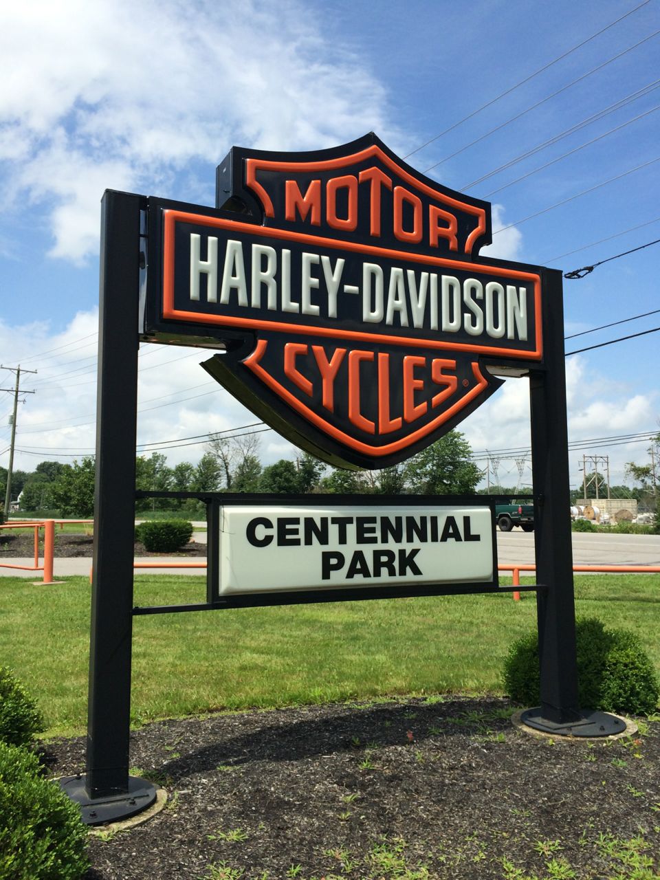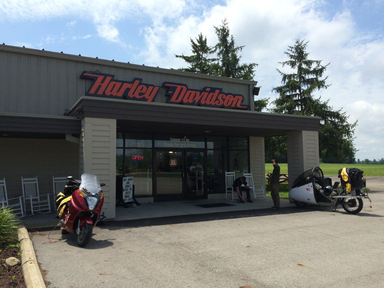 “It’s a Harley dealership! They have an electric outlet in front, a bunch of rocking chairs, and are happy to let you charge!”