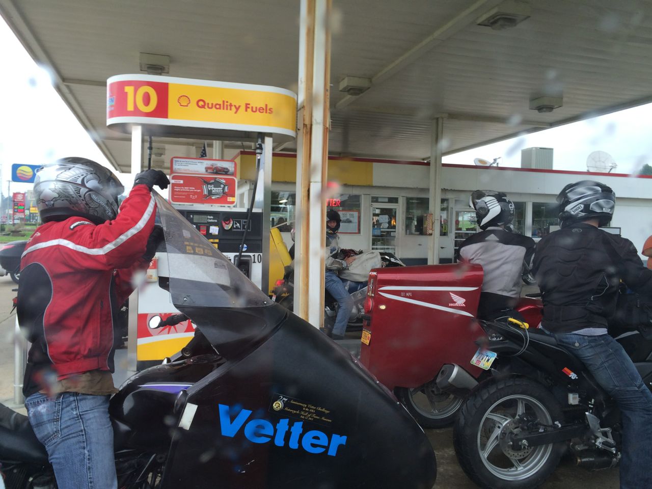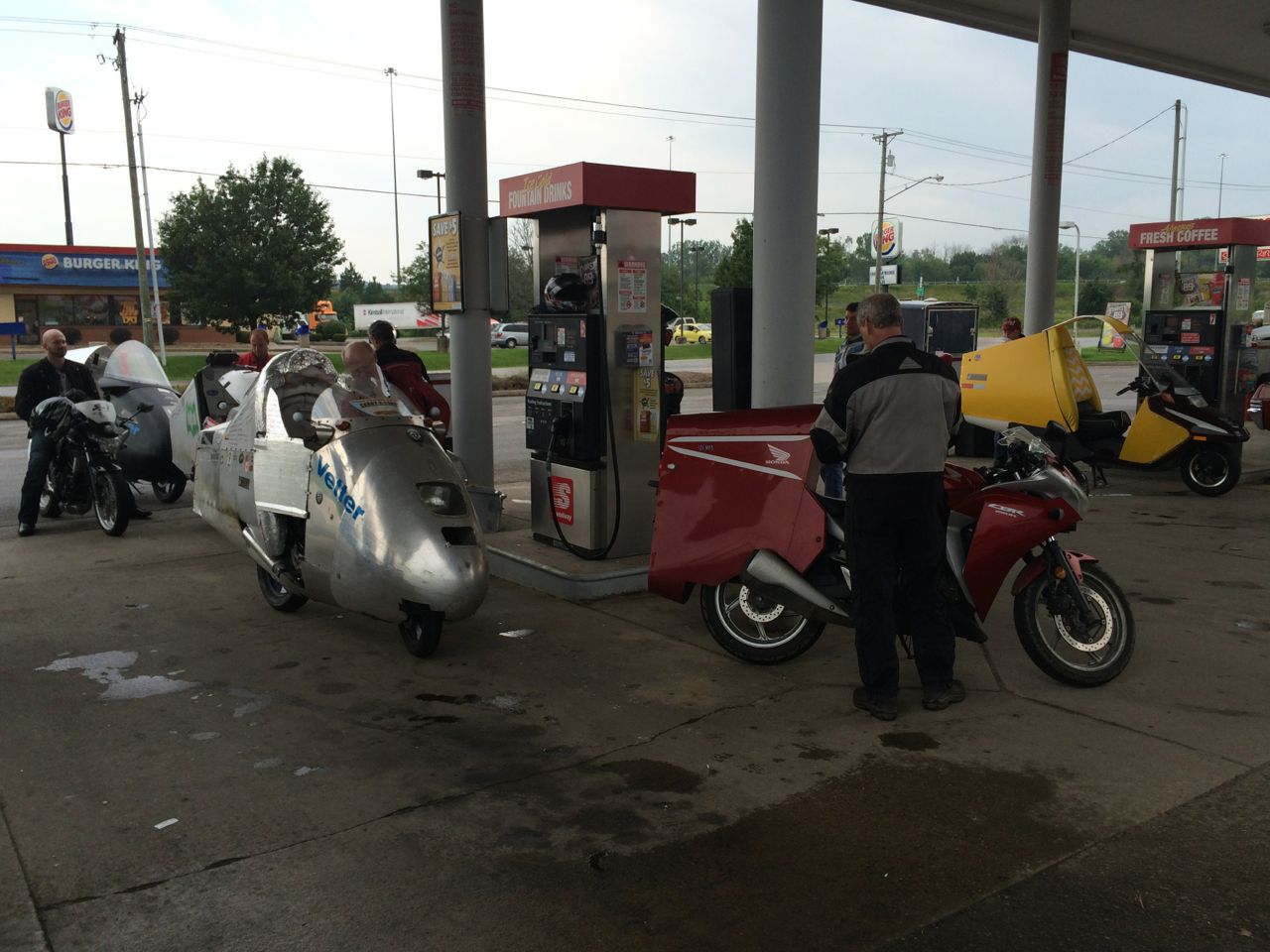 It was still an hour’s ride back to the hotel where the race started! Eventually, we caught up with all the other riders. It’s strange seeing a flock of finned and faired motorcycles out on the open road. By then, we were most of the way back to the hotel. All the cycles pulled in to the gas station next door and started filling up, saving receipts for the fuel economy calculations.