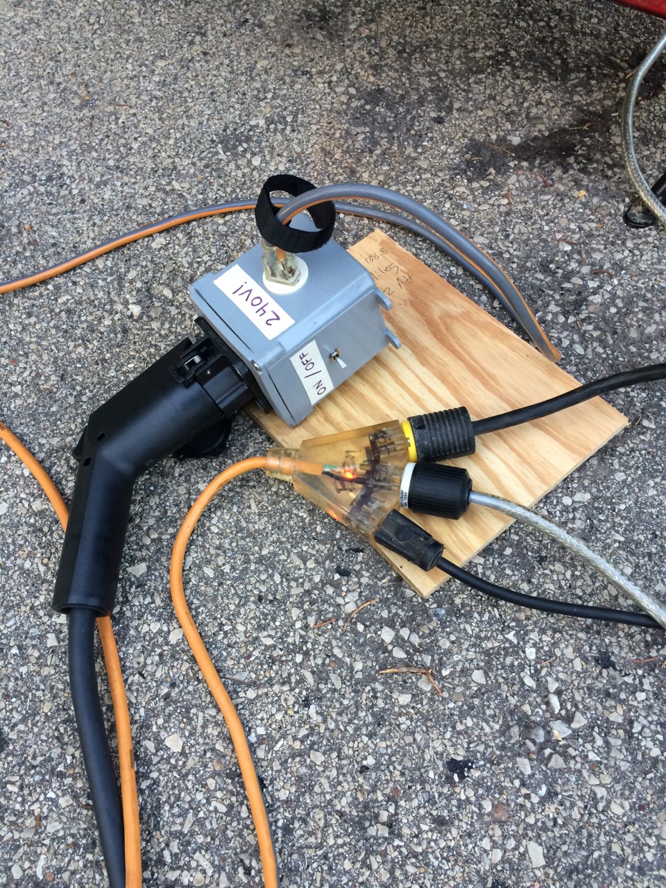 I already built a J1772 adapter to convert from EVSE to a standard electric outlet. Just recently, I purchased a pre-wired G.E. WattStation J1772 home charger. I plugged my adapter box into the EVSE and a short extension cord with a built-in three-way in to that. I now had three outlets with 240V power. I plugged all three chargers in to that. It worked great! Not only could I run all three chargers on one plug, but the connections were also considerably cooler at 240V than at 120v!
