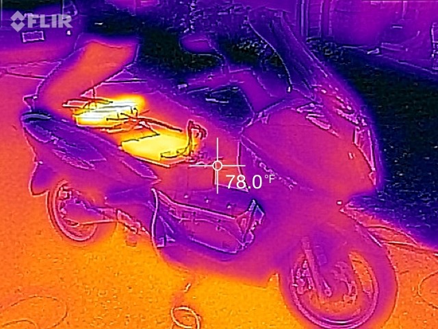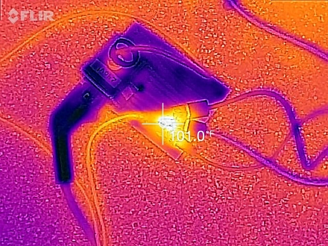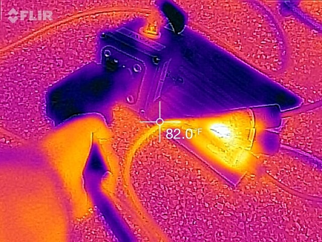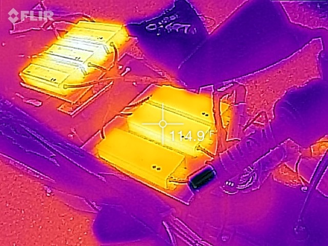 At this point, I had all three chargers going and was drawing up to as high as 4200 watts. I took a few photos with the thermal camera. Both of the Mean Well power supply chargers do get fairly warm. Powering at 120V, it’s a fair number of amps, producing some heat at the electrical connections.