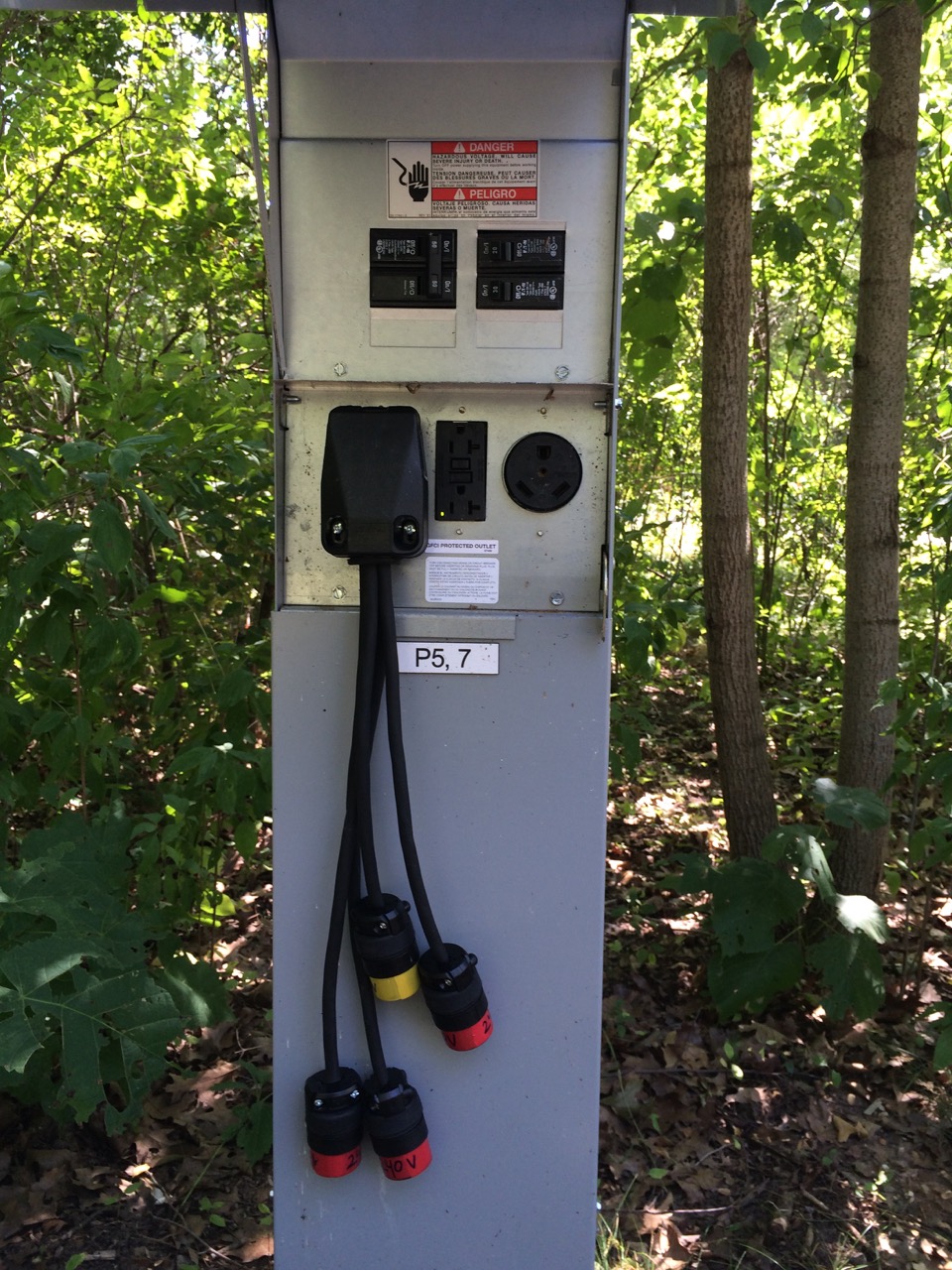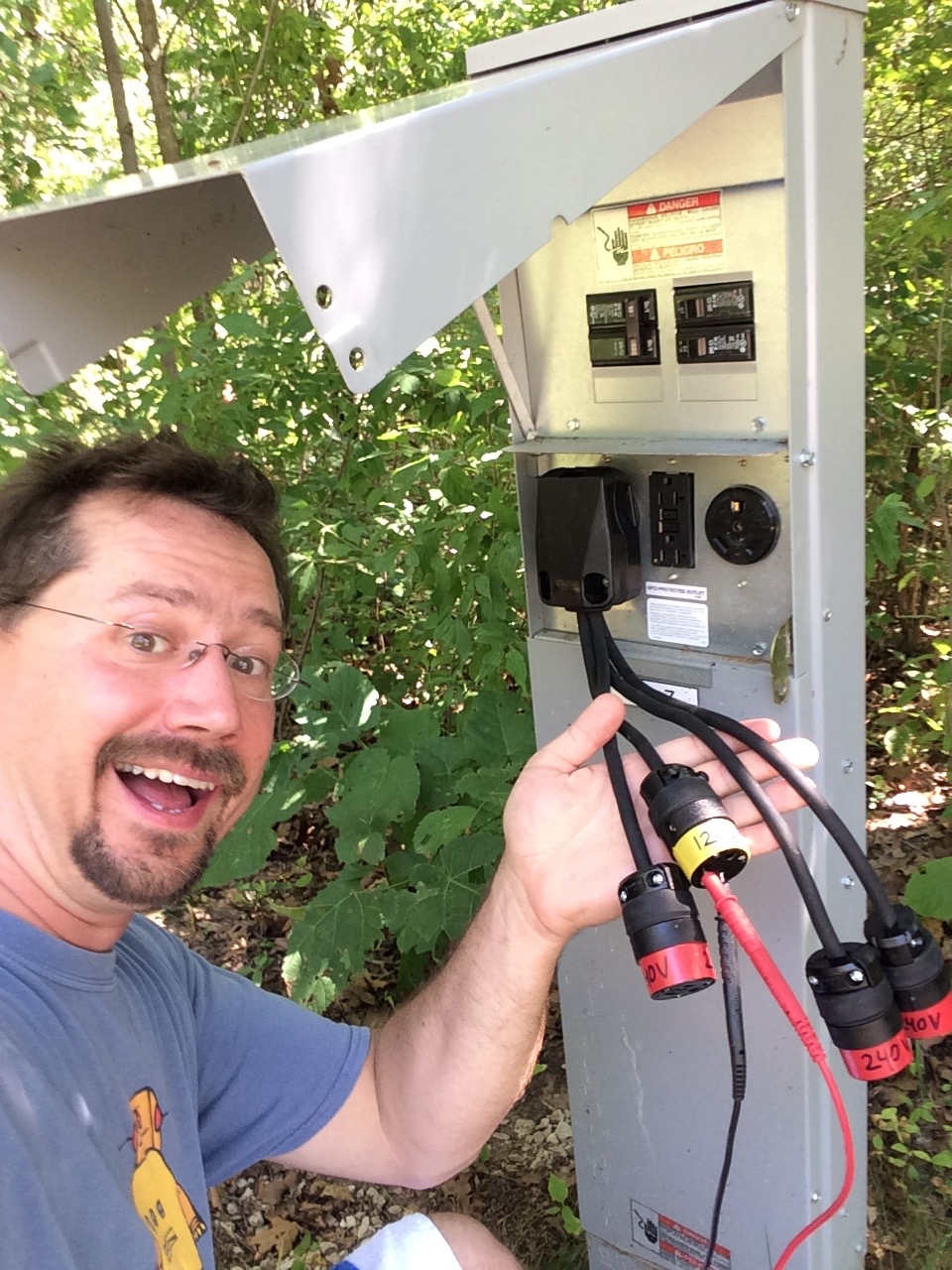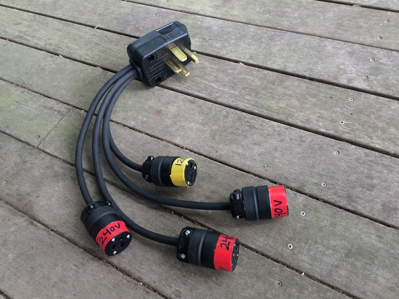 I walked over to an empty electric camp site and tested it out. I plugged in the adapter and checked the voltage output of all four plugs. Sure enough, 240V coming out of three of them, and 120V out of the fourth. I even made sure to color code the plugs to avoid accidental confusion. Always a good feeling when I build something and it neither trips a breaker nor bursts into flames.