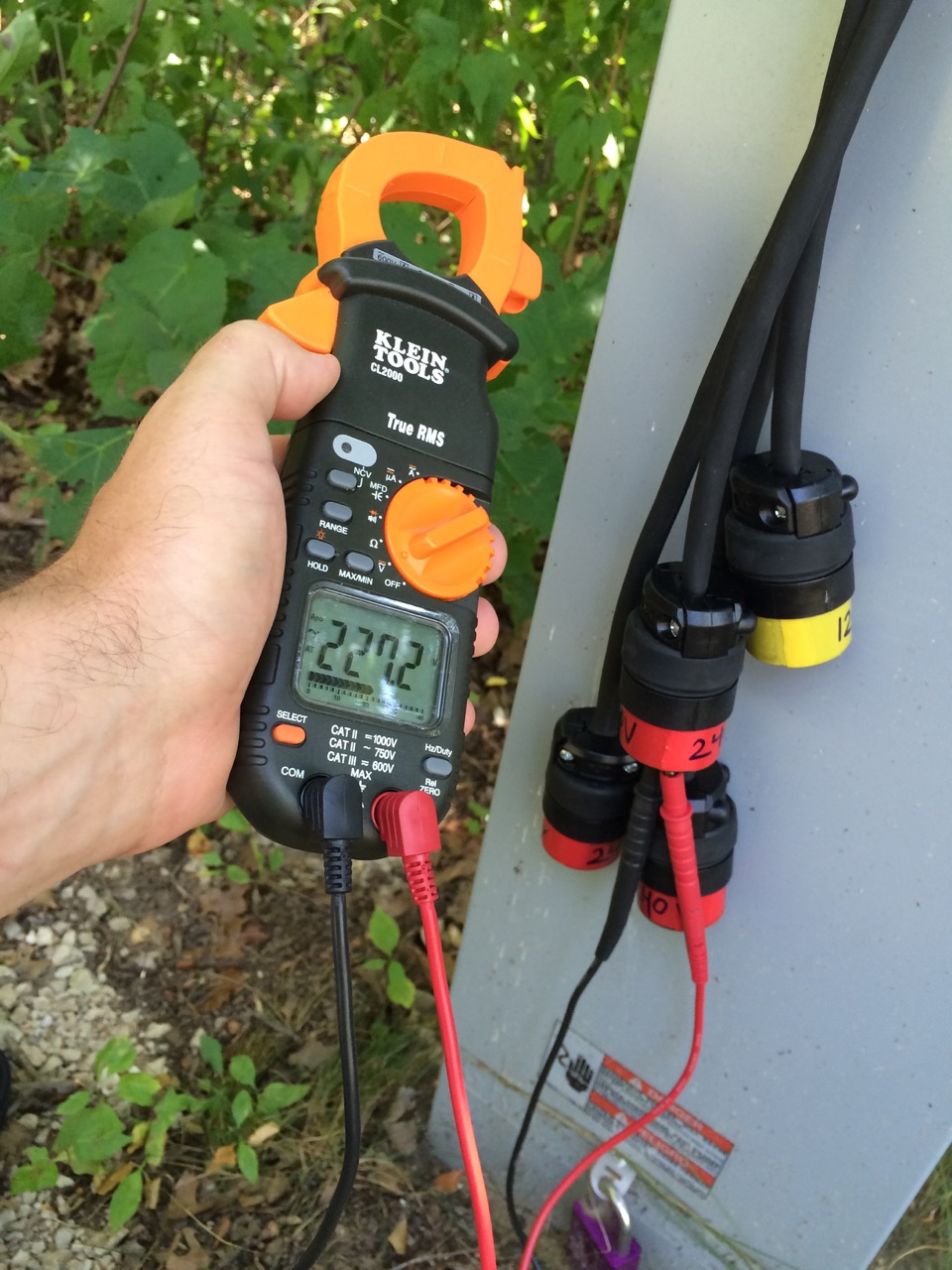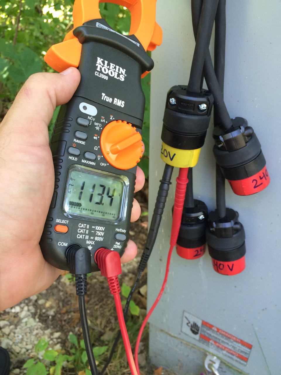 Today, I took the family over to visit friends at a beach at a state park. The park also has a camp-ground, including electric sites, so I brought along the power adapter and my multimeter. (I didn’t have the cycle there. Hard to carry three people, a cooler, a solar over, etc. all at once on the Vectrix…)