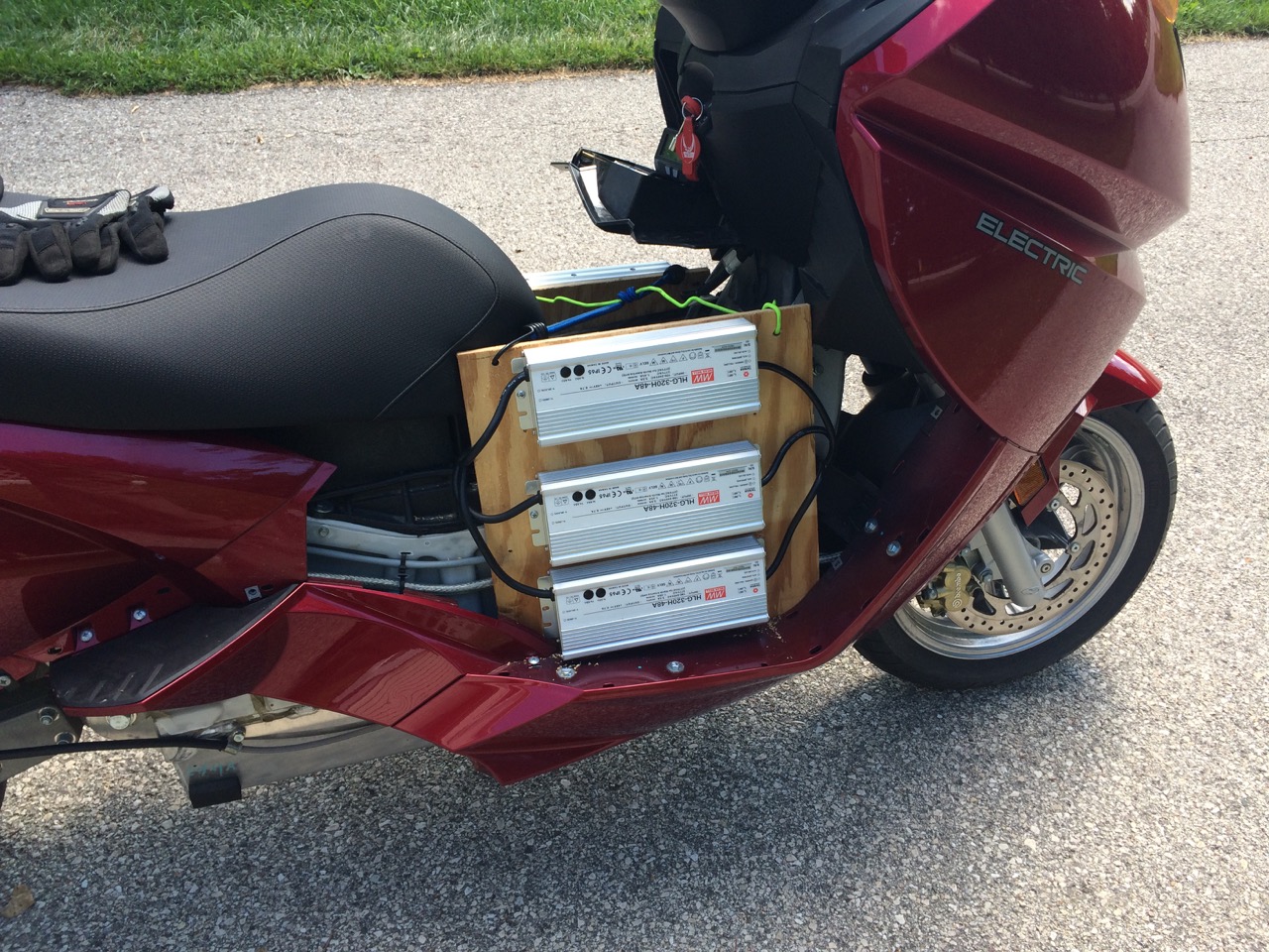 To start with, where do I put the second two chargers!? While I could make them fit in the trunk, it would be a tight squeeze, and I would need to pull them out while actually charging. Also, it’s a pretty short DC connection from the chargers to the battery itself. So, I decided to mount them temporarily on either side of the battery pack. There was still enough room for my feet, and the chargers were easily held in place by the frame of the bike and some bungie cords.