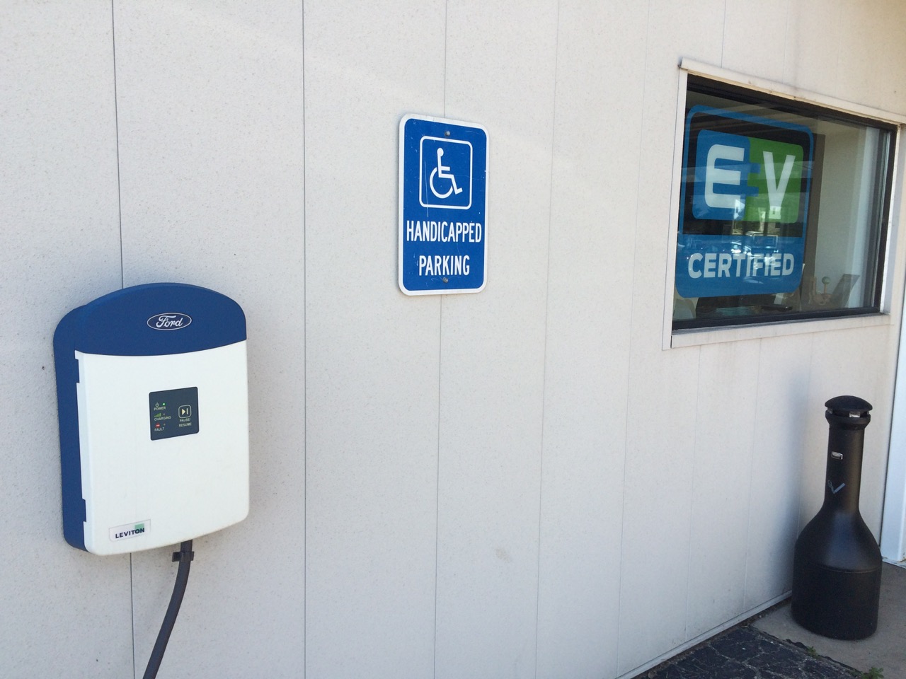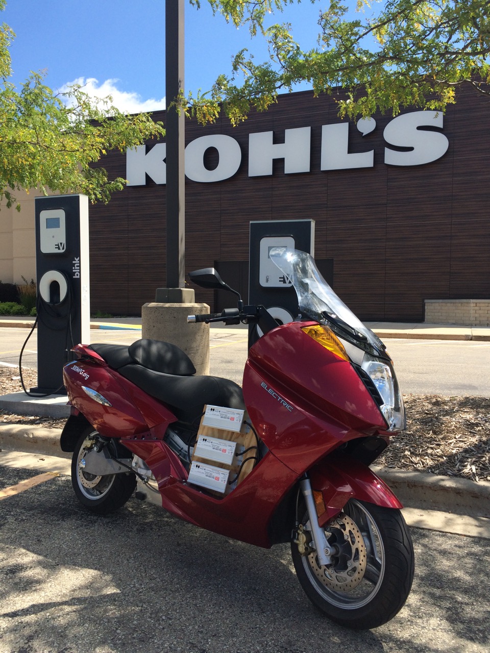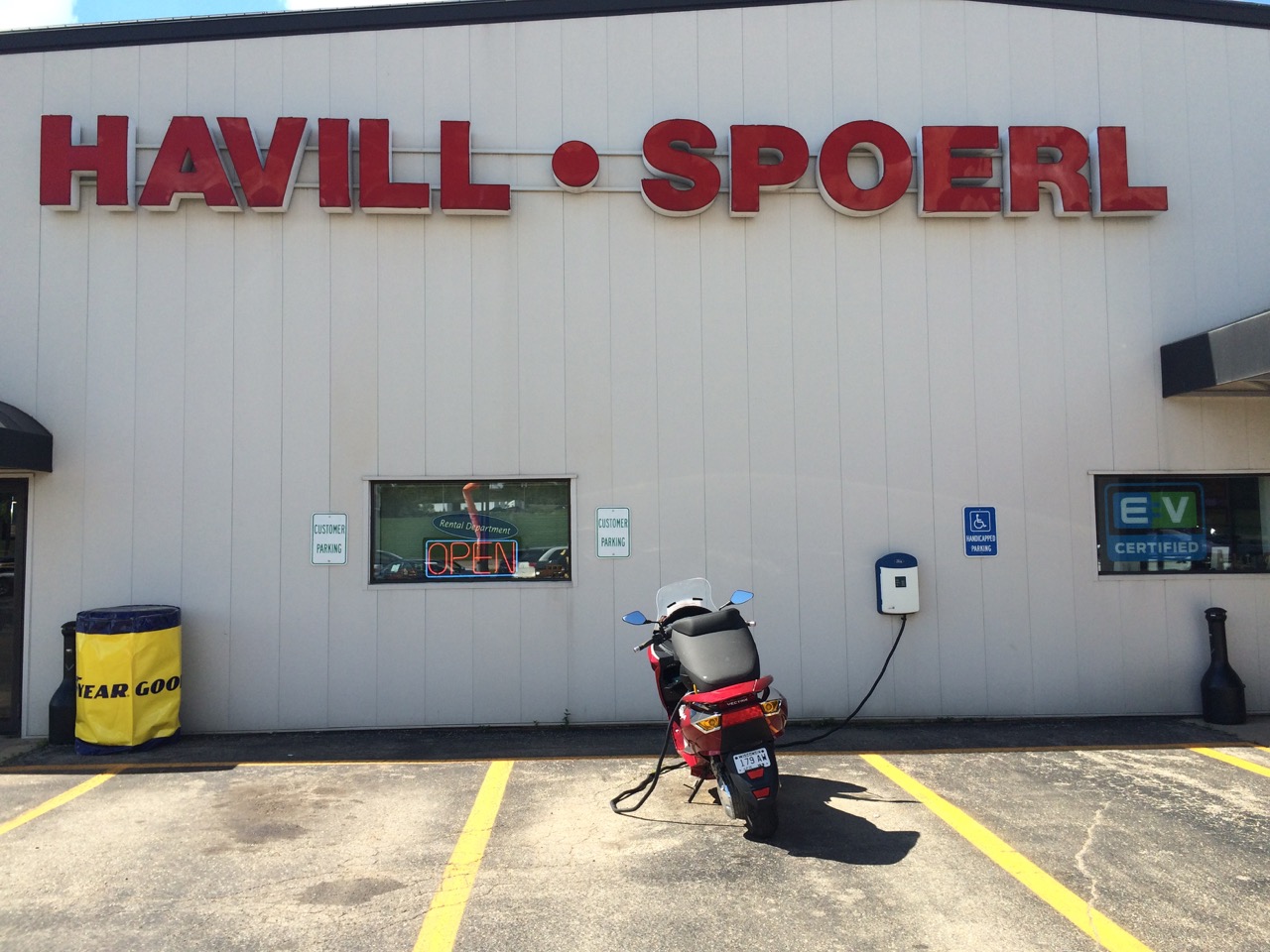 Continuing on my journey, I hadn’t decided whether to stop at the Ford Dealership or the bowling alley. Frankly, if I stopped at the alley, it might actually be fun to bowl a game or two. I hadn’t done it in a while, but I can usually bowl a 150, and my high game was 183. I missed the turn for the alley, so I instead took the next turn, which brought me right in to the Havill-Spoerl Ford parking lot. I pulled in and instantly found the charger on the front of the building. I parked, asked for permission (quickly granted by friendly staff) and plugged in. Having all three chargers running through a splitter into the J1772 adapter makes charging the cycle about as easy as a LEAF or other commercially available electric – just plug in the big cord.