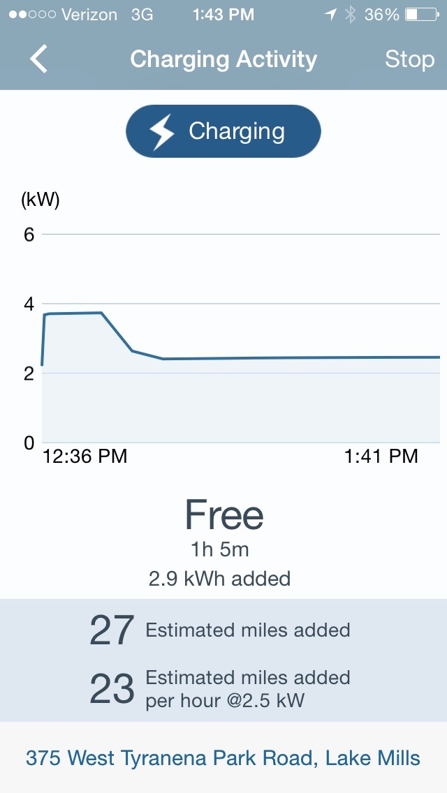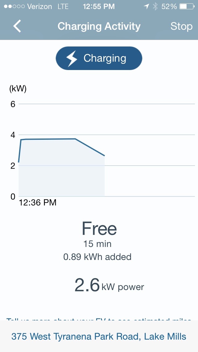 One my way back to the Lake Mills Market, I realized that I still had the ChargePoint App on my phone open. While it normally shows a map of where charging stations are, while actually charging it gives you information on your charge, including a graph of current. It also gives an estimate of range gained, based on what vehicle you drive. The Vectrix wasn’t listed, so I entered a Brammo Enertia, which seemed the closest match. Back at the bike once more, the charge wasn’t up to 100%, but I had put in 19.9AH, while I had used 22.36 AH to make it from home to the charging station. 89% charged while just eating lunch doesn’t sound bad.