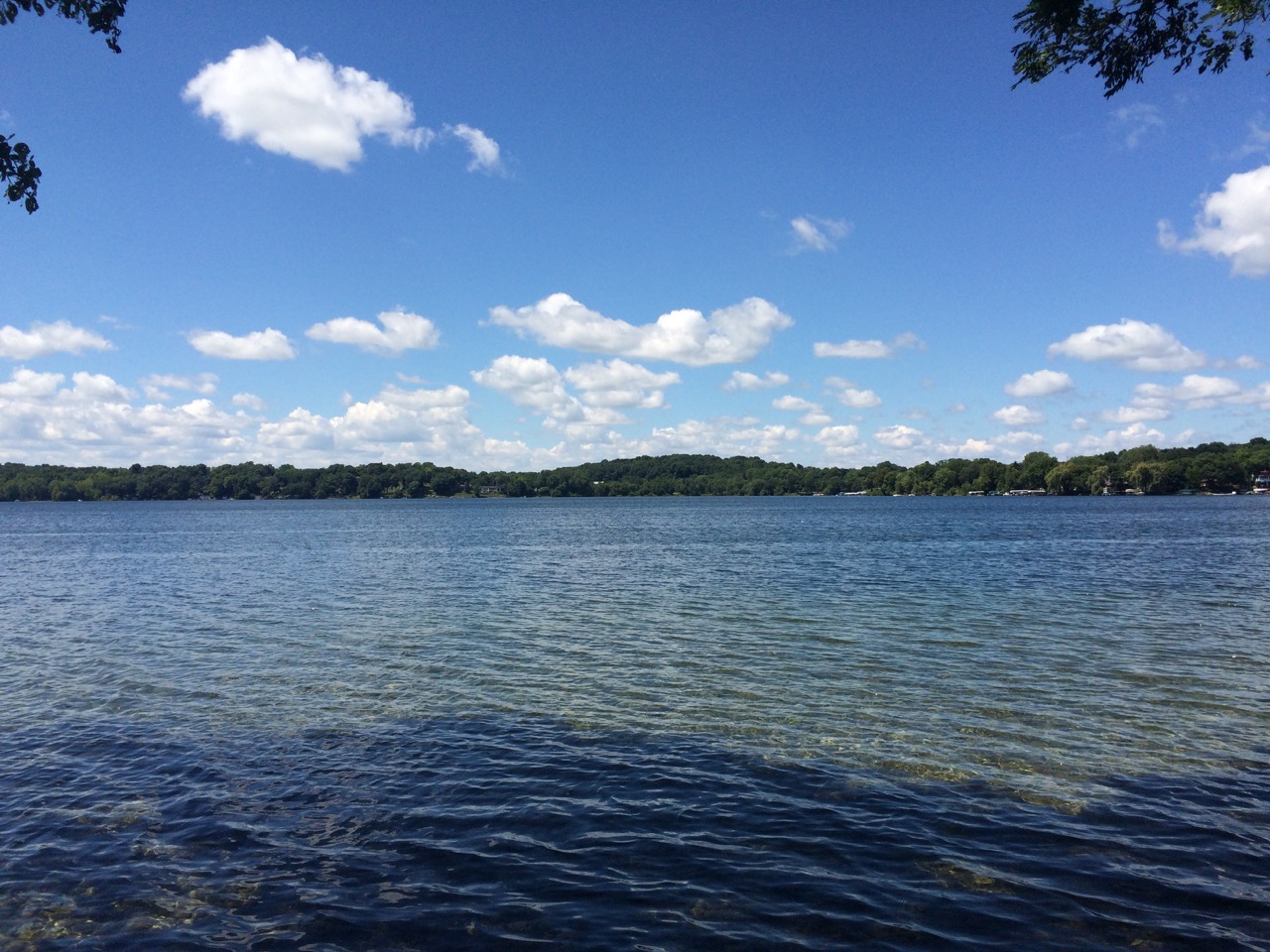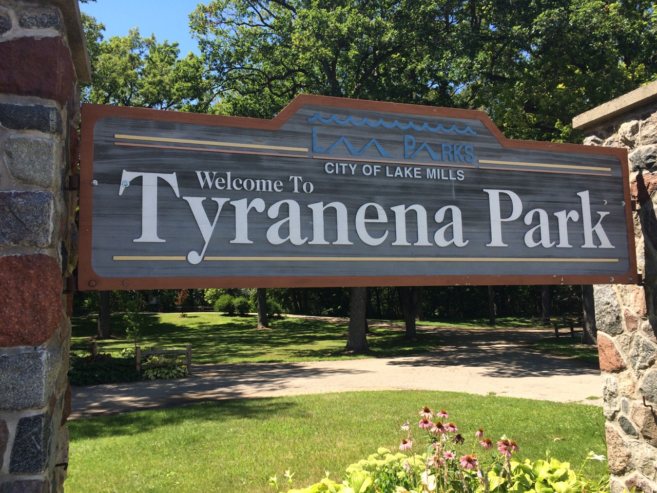Once I was charging, I headed inside the store to find some lunch. By now, I was HUNGRY! I had lost nearly an hour from not being able to charge at the first charging station and the extra travel to get to the next one. I got a couple of hot turkey sandwiches (the deli special of the day,) a tray of California Rolls, a giant pickle, and a drink. When I last checked the map, I also noticed a park just west of the store, about one “country block”. I walked over there, grocery bag in hand. Tyranea Park is wooded and has plenty of picnic tables in the shade, just off a parking area. Better yet, the property connects to Rock Lake. I walked to the lake and sat with my feet just above the water, eating my lunch in the shade of the over-reaching hardwoods. It was a quite a view.