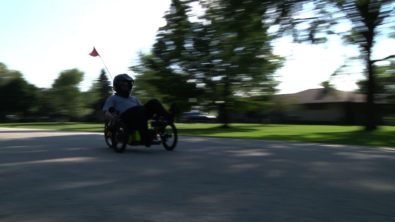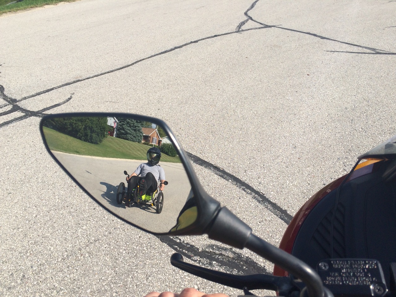 “I HIGHLY recommend a helmet”, Dustin suggested as I hopped on. Sure thing, I had my motorcycle helmet handy. Good thing too – this cycle can go FAST! With just a twist of the electronic throttle, I was instantly zooming down the street! The speed seems all that much faster with my butt only a few inches off the ground. The “tank-steering” of a recumbent was different than I was used to as well – it was VERY responsive. Top speed is 50 MPH!