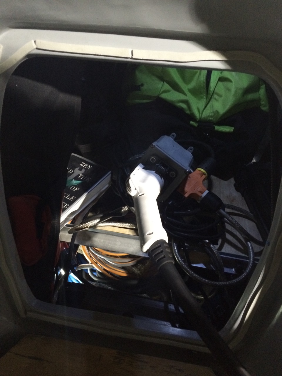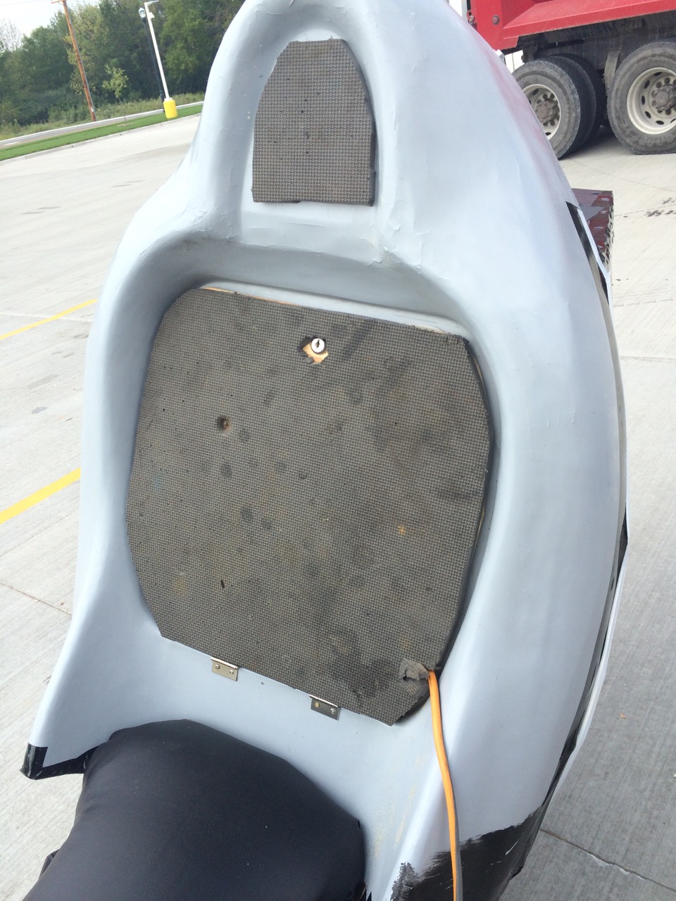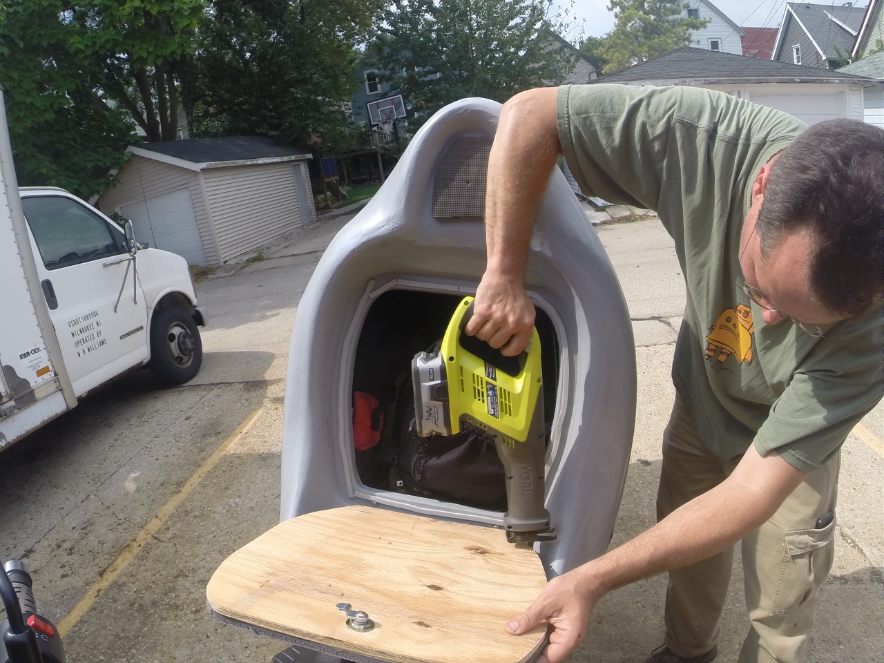 As I was ready to leave, I realized something. There hadn’t yet been a single time that I had charged the bike in a non-secured location. So far, I had simply left the back-rest/hatch cover OPEN to pull the power cable through to charge. I wouldn’t be able to lock it AND charge at the same time! Since I was at the Makerspace, I had plenty of tools available. What I didn’t have was time. I already made it to the Makerspace a little behind schedule, and spent more time there than I planned. I had an appointment to meet somebody at my next stop, and needed to get there fast. So, instead of “properly” making some sort of access port for the power cord, I simply butchered a notch into the plywood with a cordless recipro-saw. It was quick and ugly, but let me get on the road. And I didn’t even saw through the seat as I did it.