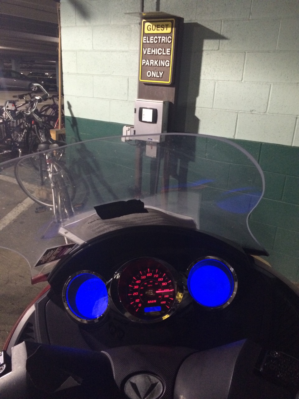 I pulled into the underground parking hidden below the manicured front lawn and flower beds. I had to circle a bit, finally locating the charging station near the far end, by the bike racks. The floor was marked by a surprising amount of oil stains. I think the EV charging spaces are relatively new, being used by maintenance vehicles before that. I pulled out my J1772 adapter and plugged in all three of my chargers to it. I was glad to see that I had made the notch in the plywood cover large enough to accommodate the thicker charging station cable. That way, I could run the cord INSIDE the motorcycle and LOCK UP the adapter. No punk teenage ner-do-well would be able to pull a prank on me by unplugging the bike. I grabbed a book and headed back up to ground level.