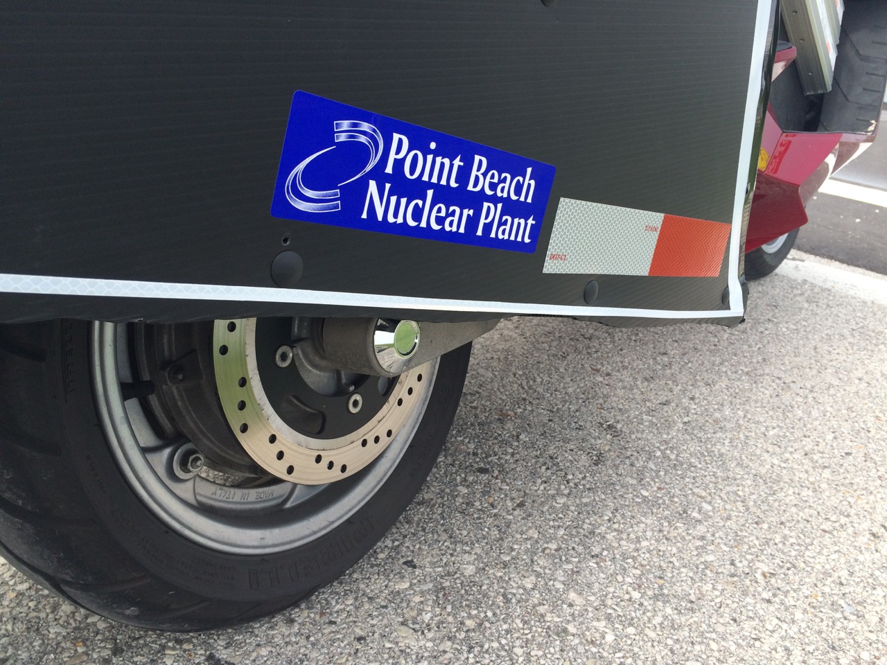 Before leaving, I got a pair of complimentary bumper stickers from Ruth Ann, and slapped them on opposing sides of the bike. The people at the nuclear power plant were great! They were friendly, inquisitive, and positive. While mentioning nuclear power is usually a great way to get an argument going among environmentalists, I think this visit actually changed my mind a bit about nuclear. No, we STILL do not have really good long-term ways to deal with nuclear waste, BUT the plant also produces ZERO CO2 – something we REALLY need to be working on right now. The actual power plant looked more like an office building than like a factory.