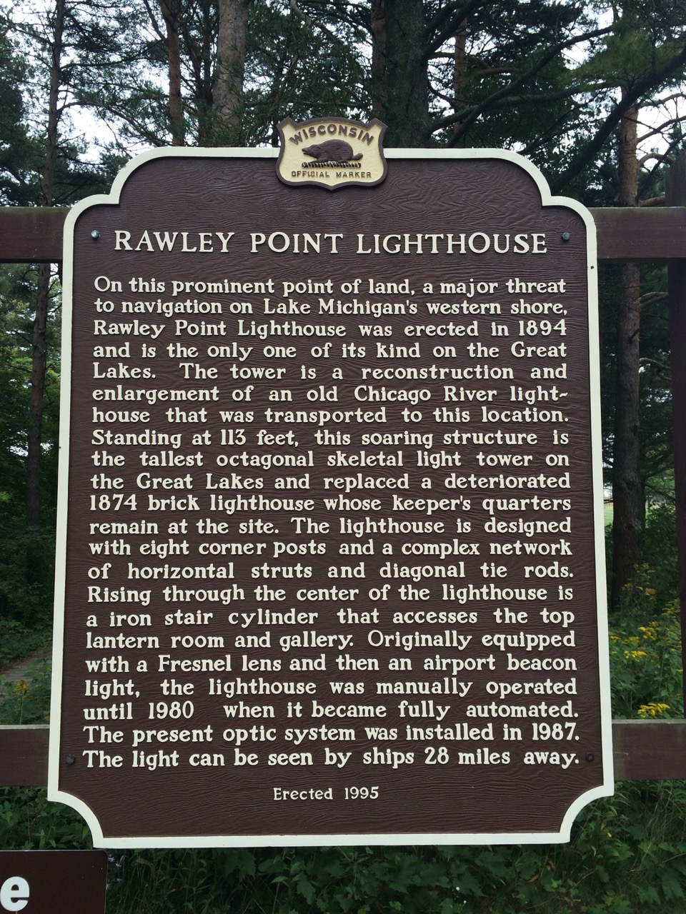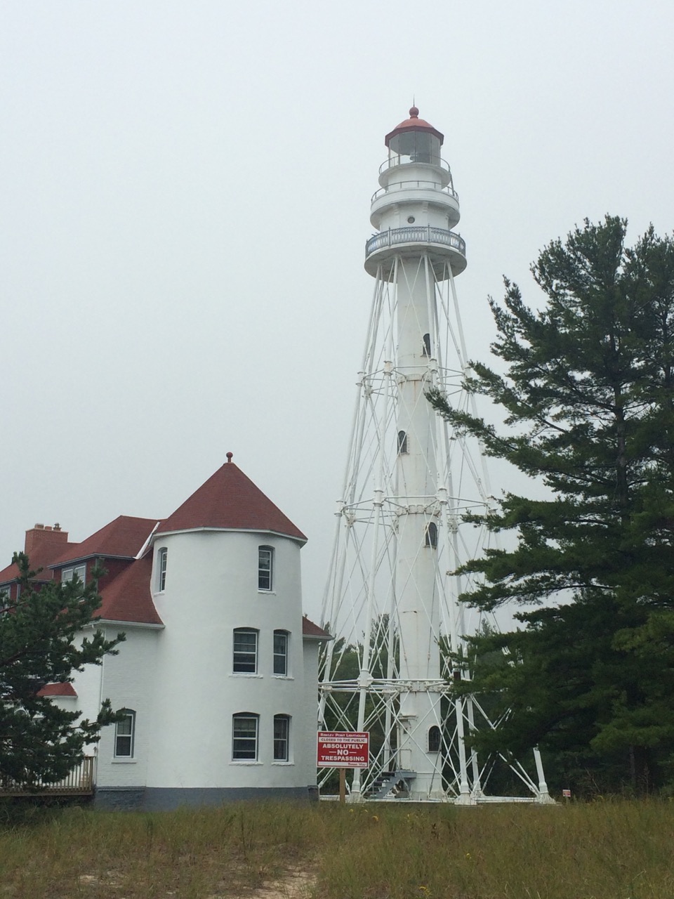 Right on the edge of the State Forest was a lighthouse. This was my first lighthouse of the tour. Lake Michigan is surrounded by lighthouses, each with its own unique history. The Rawley Point Lighthouse is interesting in that it’s been rebuilt and upgraded several times, changing from a brick house to a steel tower, converted with materials from Chicago, replaced because of the 1893 World’s Fair. The residence is still used by Coast Guard personnel, and at 2 million candle-power, it’s the brightest light on Lake Michigan. Still, the weather prevented me from getting a good photo, so I picked up a post card of it at the park office.