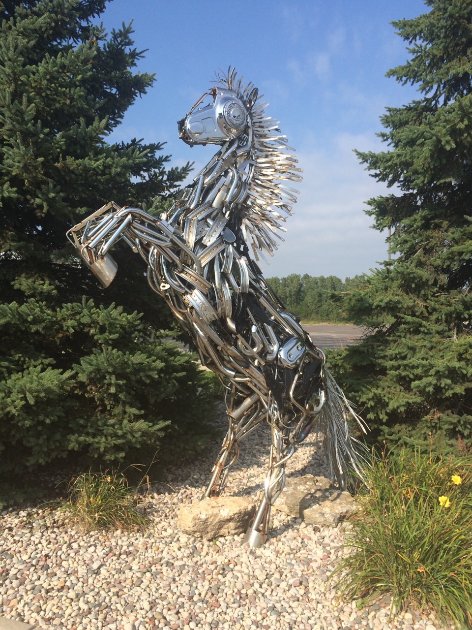On the north side of town, I had to pull over to take a phone call, so I rode into Vendervest Harley-Davidson. Although I was parked there for a while, there was ZERO interest in my cycle from the leather-clad bikers. Go figure. There was, however, a VERY cool sculpture there – an iron horse made completely from motorcycle parts.