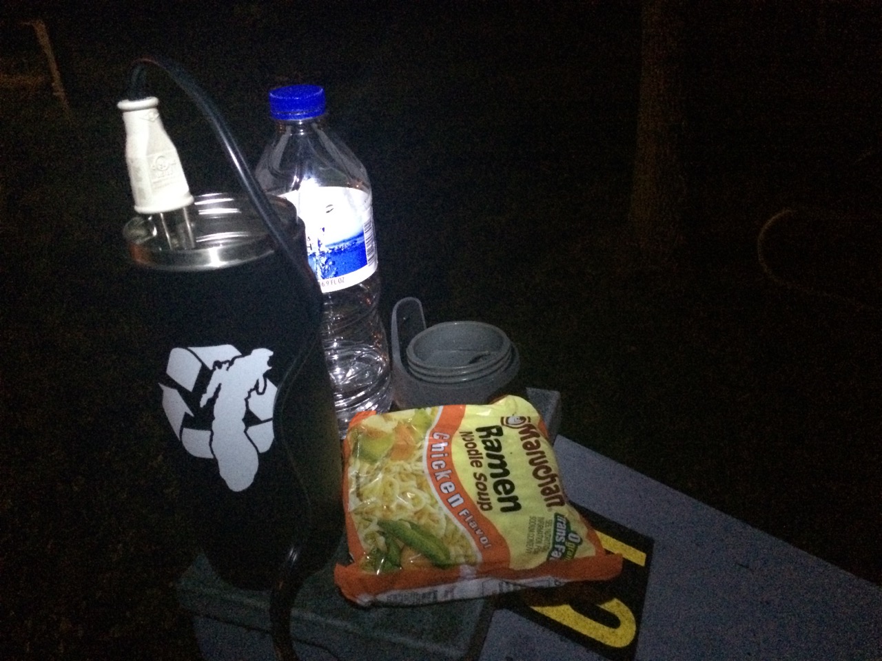 It was a little late for dinner now, but I finally had an opportunity to eat while charging. I plugged in the water heater loop, boiled a pint of water in my coffee cup, then poured it over ramen noodles in my Thermos. Not fancy, but it was hot food. I ate with chopsticks in the dark while sitting on the picnic table. “STRANGER DANGER!!! STRANGER DANGER!!!,” as the girl had returned, this time with several friends. This was getting old fast…