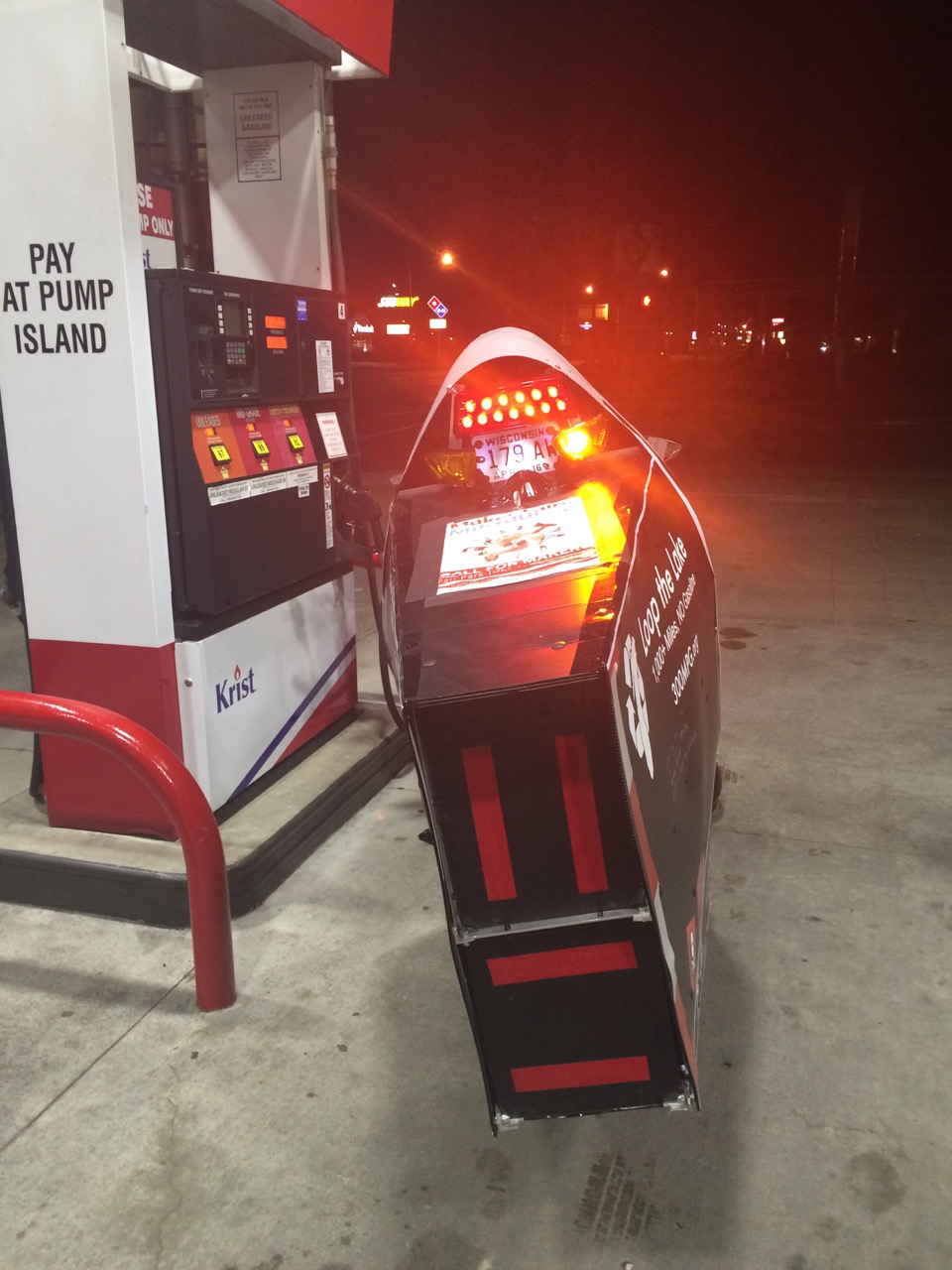 Half an hour later, I had made it up to the next major intersection. I crossed Holmgren Way, dropped off the lighthouse postcard at a post-office, and found my way to a bacon double deluxe cheeseburger. While at Culvers, I used the wifi to check in on how my bike was charging. On the way out, I stopped at an office supply store and bought a pack of silver Sharpie brand markers. These are permanent markers that write silver ink on black material. I had wanted to log my travels right on the side of the bike, and the marker I intended to do that with wasn’t working well.