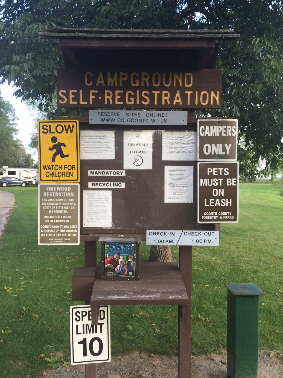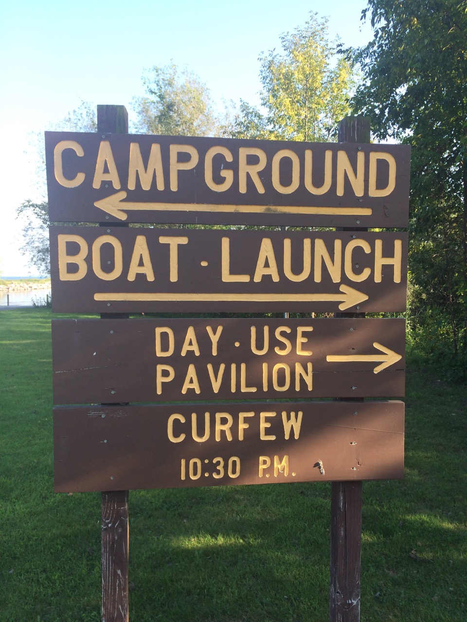 It was 8:30 at night. No, I had crossed a time-zone, that made it 9:30 at night. At the entrance to the park, they were just getting ready to close up. I saw a sign saying that they did have a campground there. Would they have electricity too? I talked to the ranger and purchased a season pass Michigan State Parks vehicle sticker. I needed to make a decision – would I just camp here for the night, or would I charge and keep riding? I explained to the ranger how I wanted to at least charge, and then maybe or maybe NOT camp that night. She had no problem with me doing either. (The fact that I just spent a bunch of money on the park sticker probably didn’t hurt either!) There was only one empty camp-site, and the ranger pointed out on the map where it was, then closed up for the night.