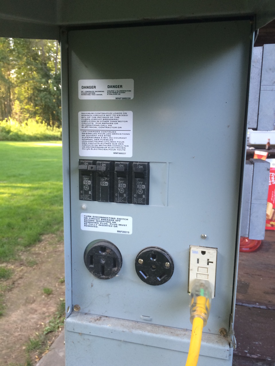 Near the south end of the park was a pavillion that could be reserved and rented. An extended group of family and friends had it boxed in with four giant RVs, radios blaring rock and roll music, bubba-kegs of beer in hand. I checked the electrical there and saw it included 240V power. I snapped a few still images and uploaded them to Plugshare.