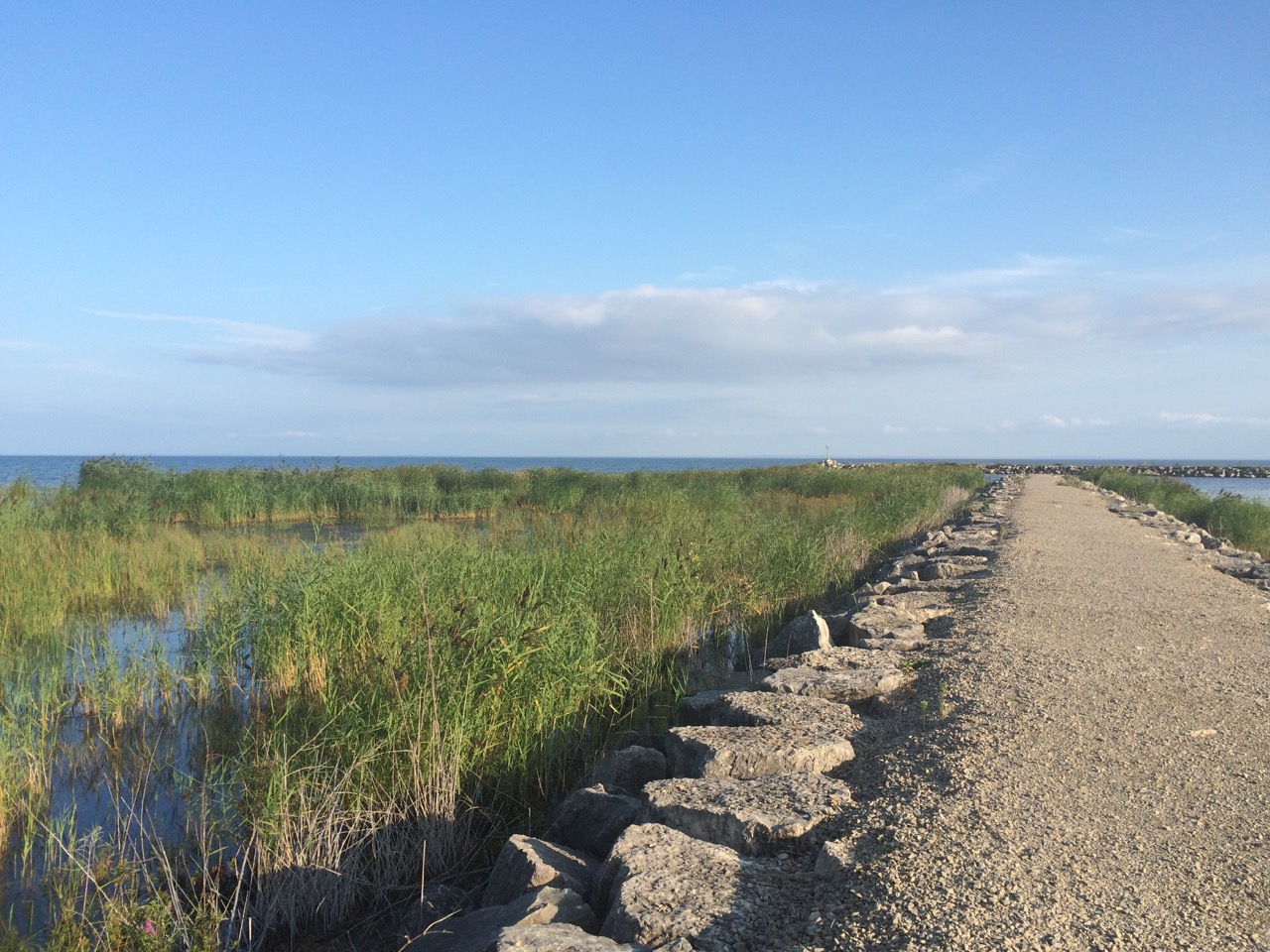 I walked over to the Lake. Finally, without darkness or fog, I had my first real view since leaving Milwaukee. The sky and water were both true blue, with waves rippling north, east, and west. The sun was getting low in the sky. It was beautiful.