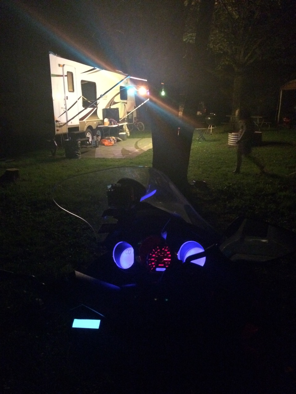 I rode in to the camp-ground. If the people at the last campground were having fun, the folks at this one were having an all-out party. Music was cranked. Most RVs had some sort of festive lights hanging from them. I’m pretty sure I saw at least one disco ball. I pulled out my RV-50 adapter and let the bike soak up 240V power. A ten-year old girl stepped out of the RV next to me, screamed “STRANGER DANGER!!!!”, and ran off into the darkness…