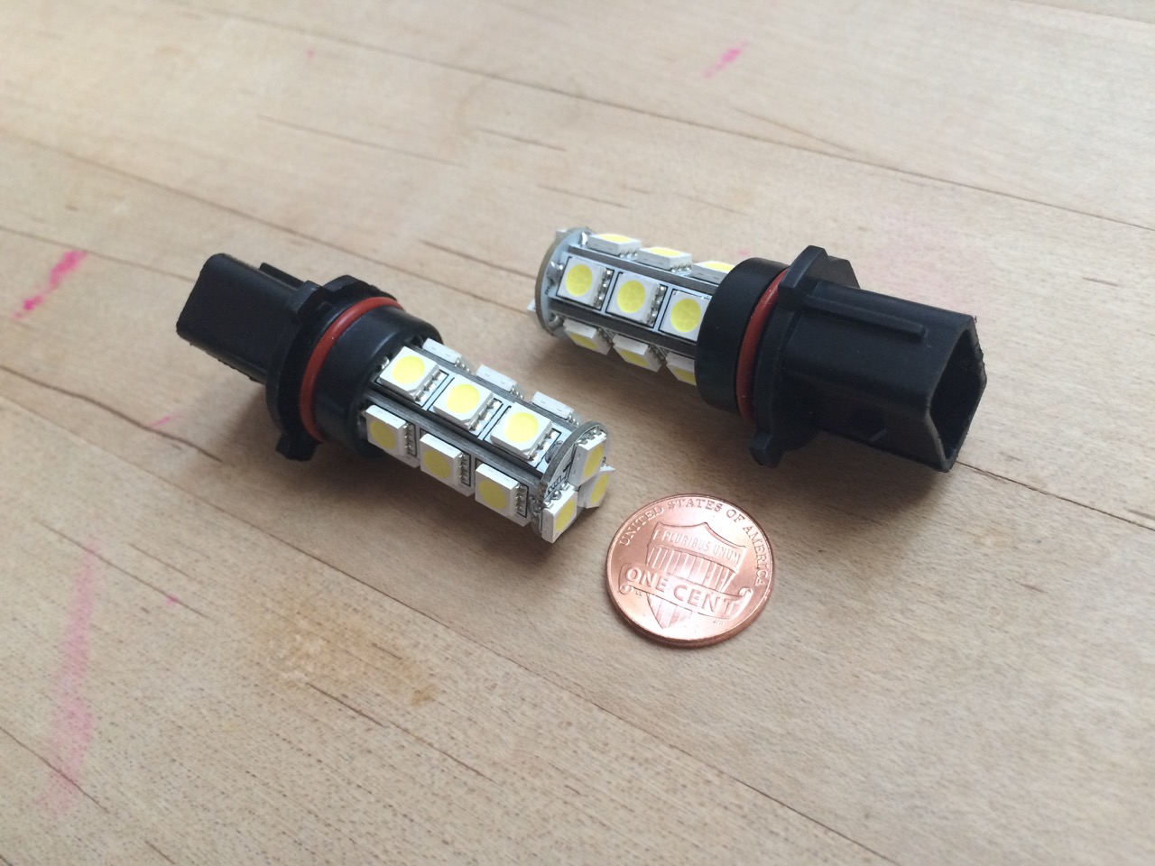 I ordered a pair of “corncob” LED bulbs from the internets. These cost me $8.85 for the pair and are designed for 2011/2012 Cameros. ( http://amzn.com/B00TEPTQN4 )