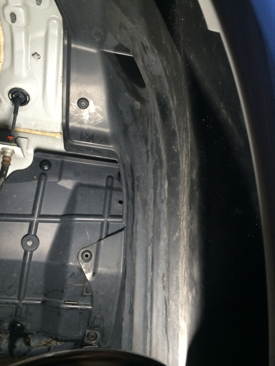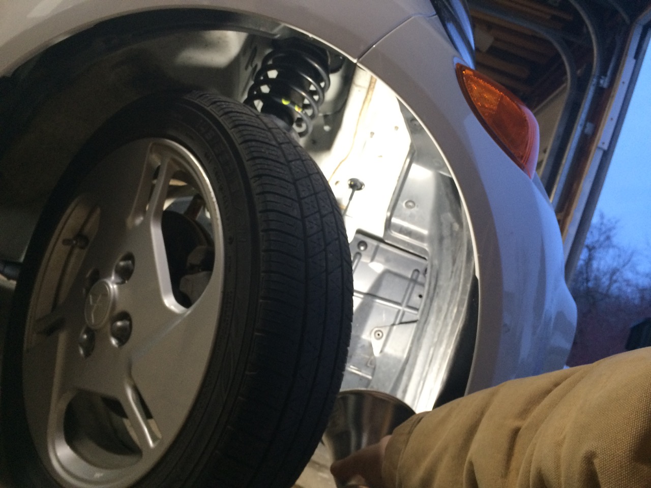To get to the light on the iMiEV, I would need to remove the plastic fender liner. I turned the steering wheel all the way to one side. Because the car has such skinny front tires, it wasn’t necessary to remove the front wheel to get in through the wheel well. The finder liner is held on at the bottom by two 10mm bolts on the very bottom edge, and a number of phillips screws running through plastic inserts. I removed the two bolts and six screws. That let me pull back the plastic fender liner. The liner was still held to the car by screws in the middle and back of the wheel well, but I could get at the light.