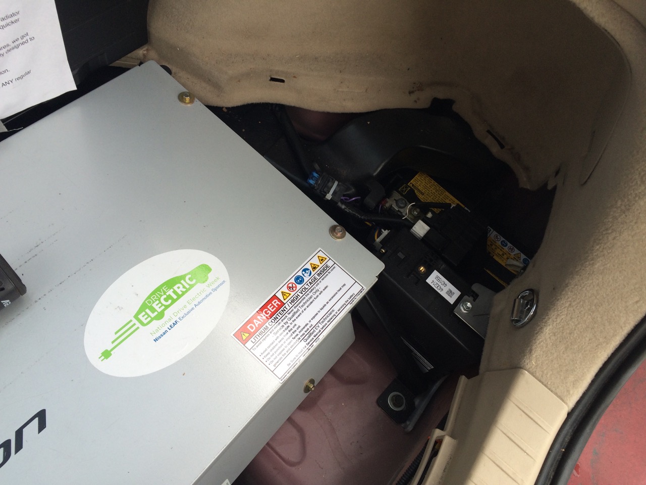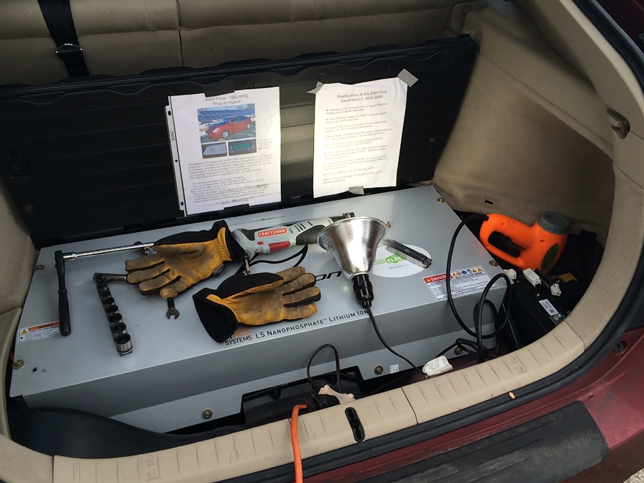 I cleared out the trunk, folded back the cover, removed the right-rear panel that covers the battery, and got to work. To start with, the top of the battery is covered with several electrical connections that go to a few small fuses right on the battery. I unplugged those. Next was removing a plastic vent that goes over the battery. One bolt screwed that to the bottom of the car. This car is modified with an aftermarket additional lithium battery (A Hymotion L-5 Plug-in System.) Unfortunately, it just made it a little harder to get to this bolt. I had several socket extensions, and I was able to get the 10mm socket down between the Hymotion and the vent. After removing the other bolt that holds the plastic vent tube in place, I removed the vent as well.