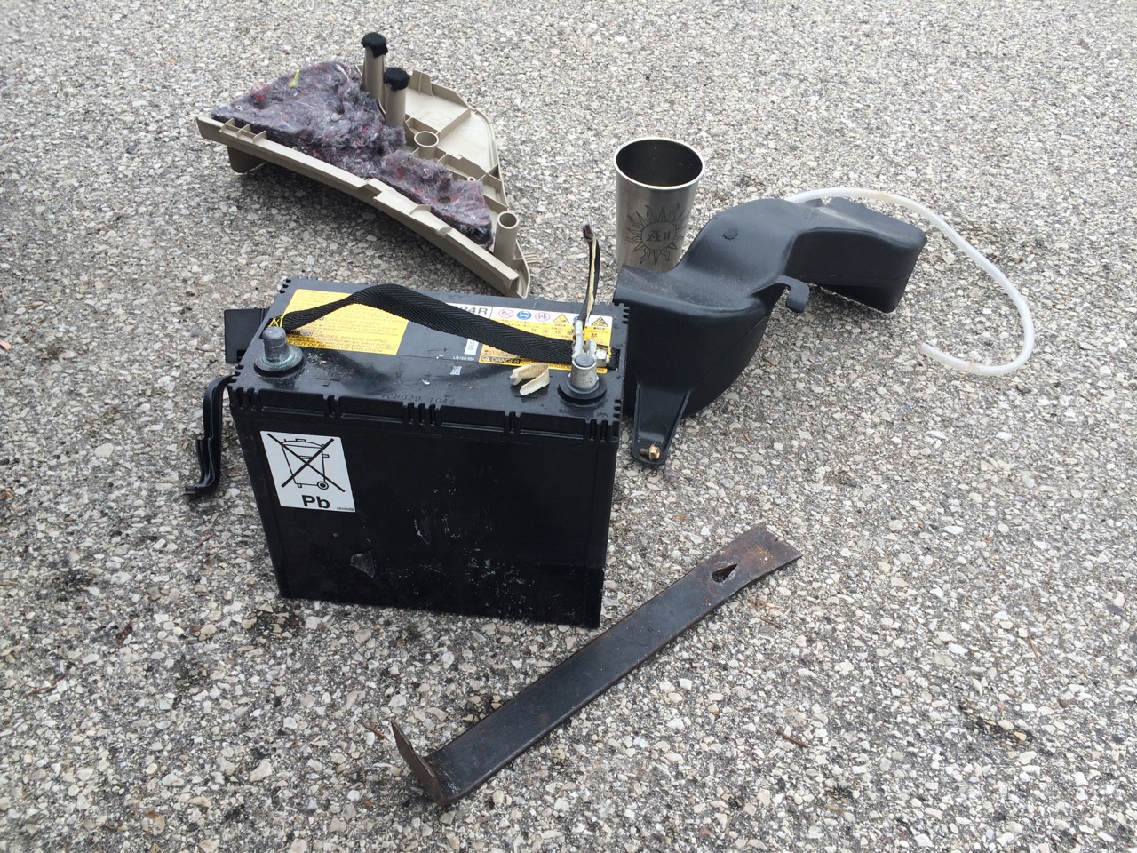 Once enough of the ice was gone, I was able to completely disconnect the battery, release the tie-down, and pry the battery loose. With the battery removed, I had more room to work. Eventually, I was even able to get at the bolts that hold in the battery bracket. I removed that as well.