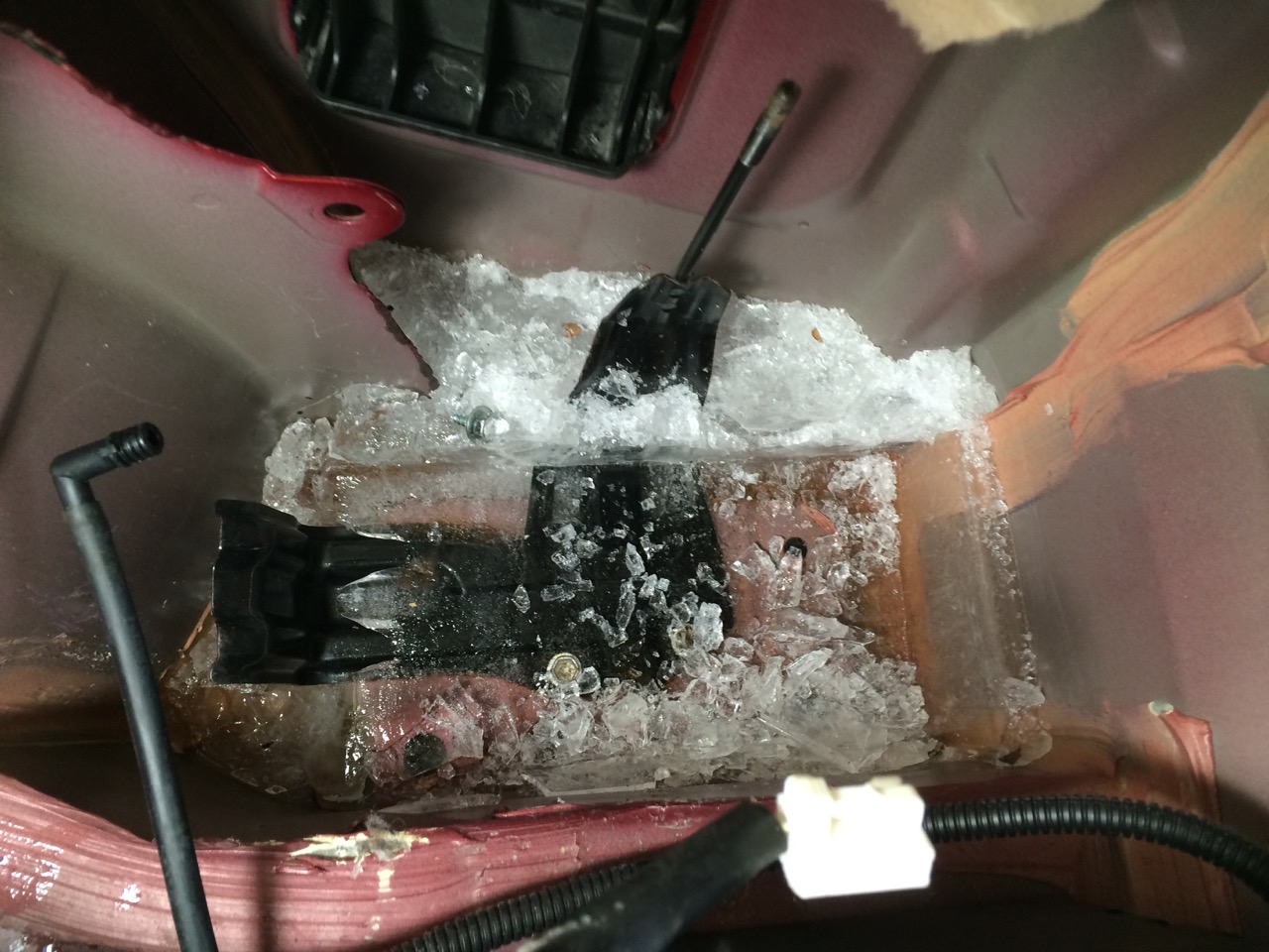 With the unnecessaries out of the way, I could finally see what the problem with the battery was. It was embedded in a block of ice. OK, well, not completely covered, but it WAS sitting in a layer of ice a good two inches thick. It looked as though someone poured about a half-gallon of water around the battery, and let it freeze.