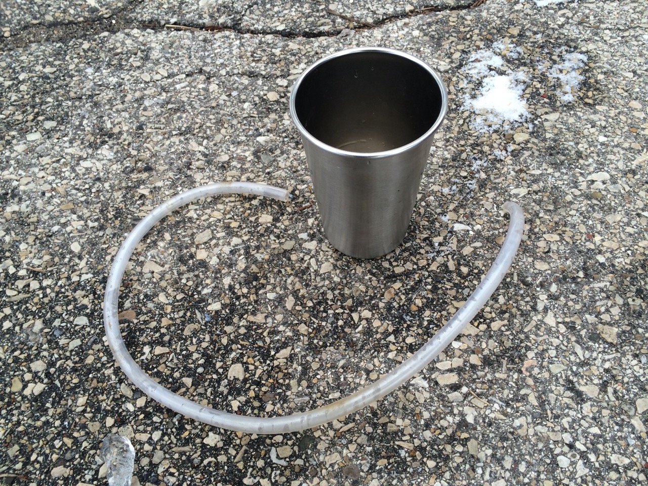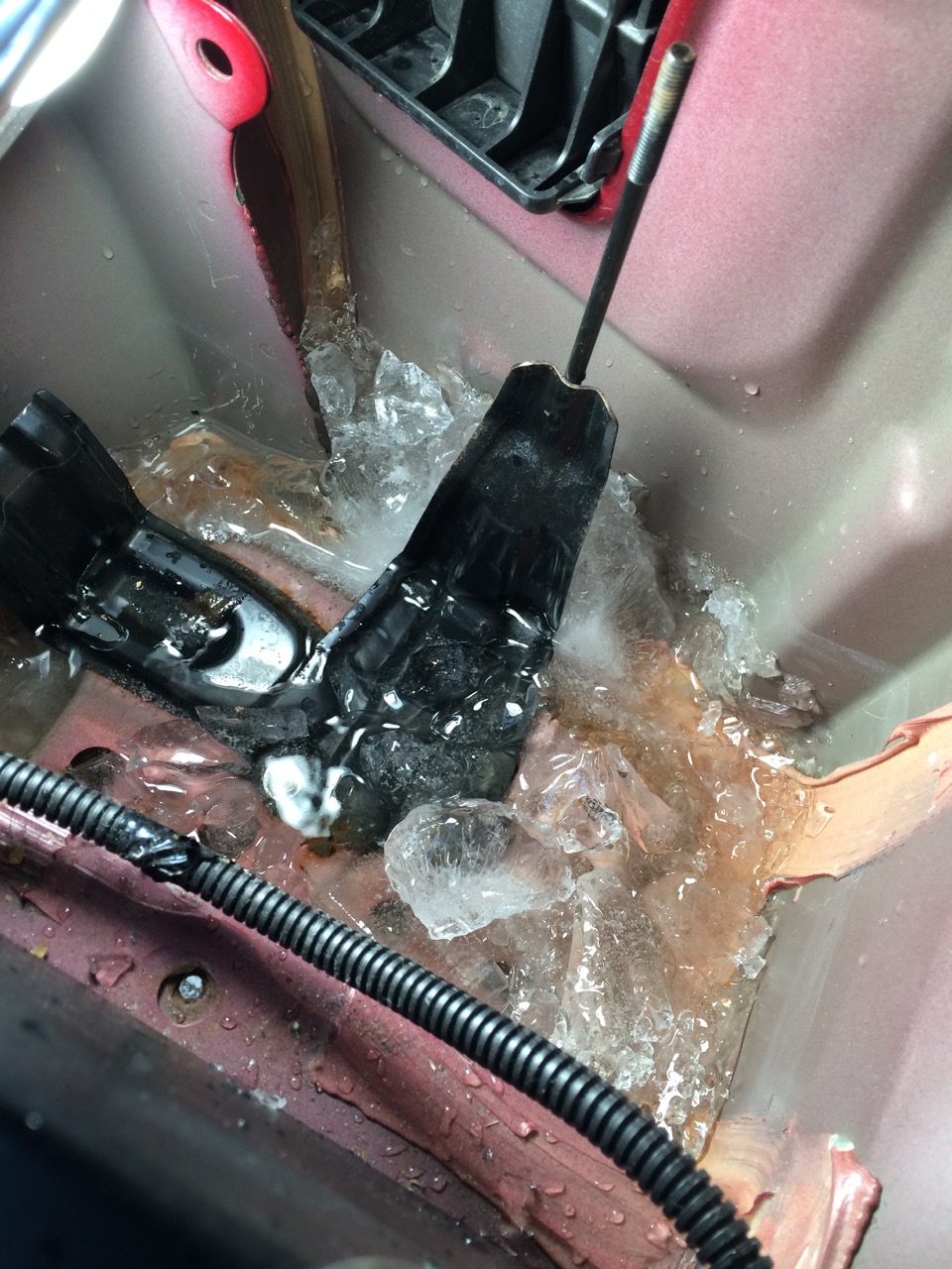 There was NO WAY that I was simply going to lift the battery out. I fetched my trouble light, 1500 watt heat gun, and an extension cord. I started experimenting with melting the ice with the heat gun. Once some started to melt, I had to figure out how to get the water out. I couldn’t really get a towel or something else absorbent easily in there. I did find a piece of vinyl tubing. After a quick check of the water to make sure that it WAS water and not battery acid or some other number or horrible liquids, I sucked on the tubing, slurping the ice-water out and spitting it into a cup. I also have a pry-bar which is a hook on one end and comes to a point on the other. I can never remember the name of this particular tool, but it sure is handy for a lot of things, including use as a large ice pick. I stabbed at the ice, chipping away with the spike, the heat gun blazing in my other hand.