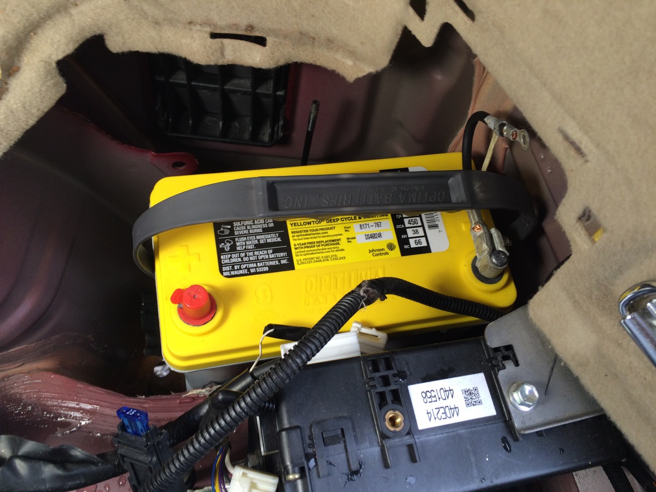 With everything else out of the way, installing the 12V Optima YellowTop battery was pretty straight-forward. I put it in, made all the electrical connections, bolted down the battery tie-down strap, and reinstalled the piece of plastic air-vent.
