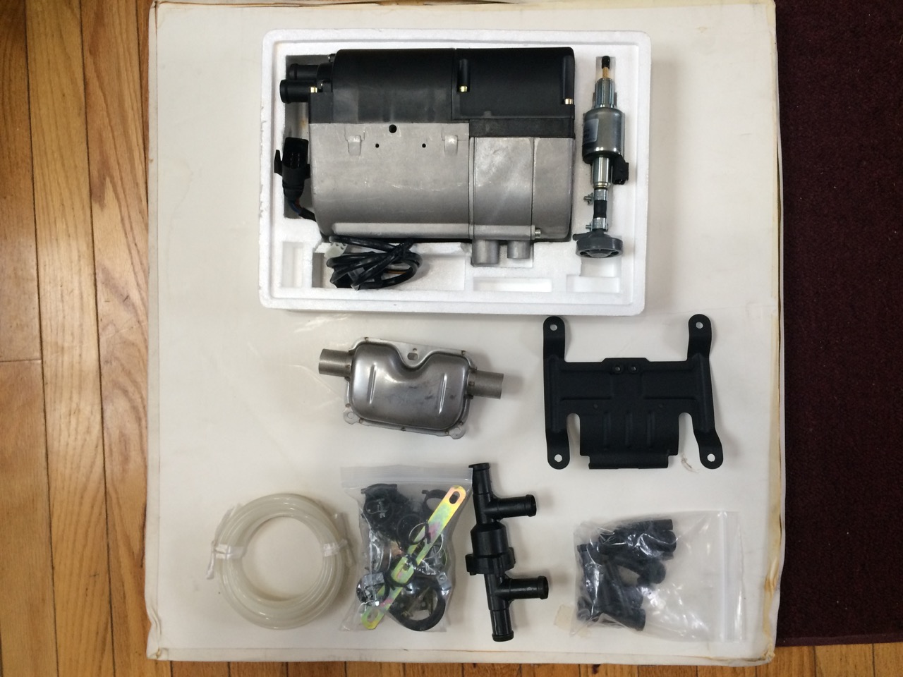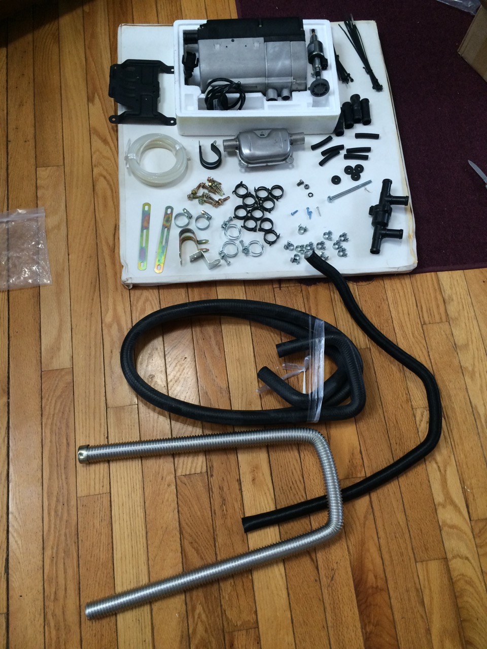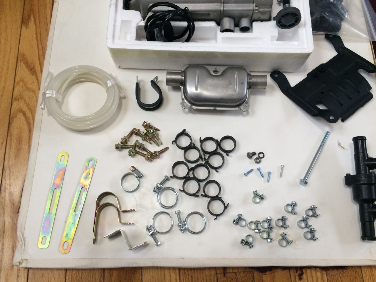 I ordered the heater a couple of weeks ago and it finally showed up the other day. Inside the box was the heater itself, radiator hose, a wire harness, and more tiny hose clamps than I care to count. I spread the items out on my living room floor to see what was there, and how it would all go together. The “Made in China” documentation was NOT particularly good, but it’s pretty obvious where the radiator hose should connect. Likewise, the wire harness isn’t hard to figure out – the four pin male connector goes to the four pin female connector, etc.
