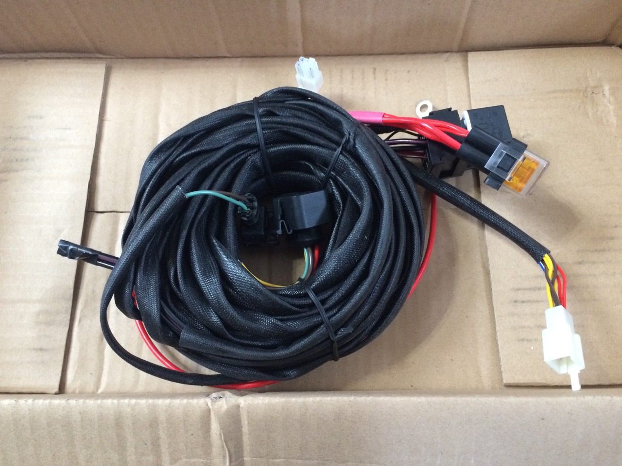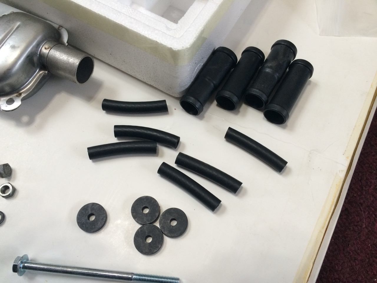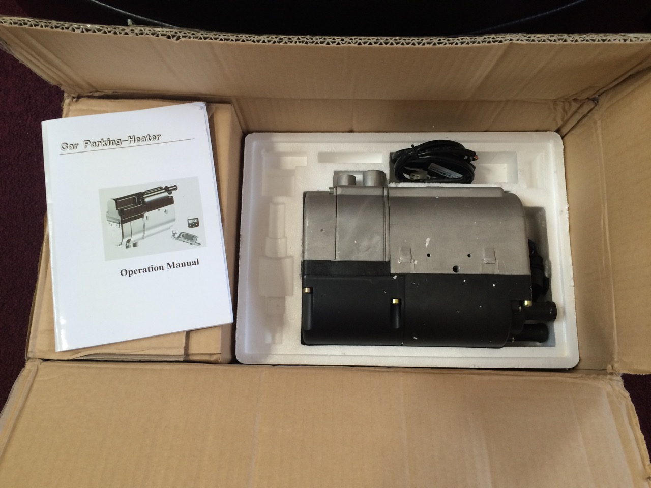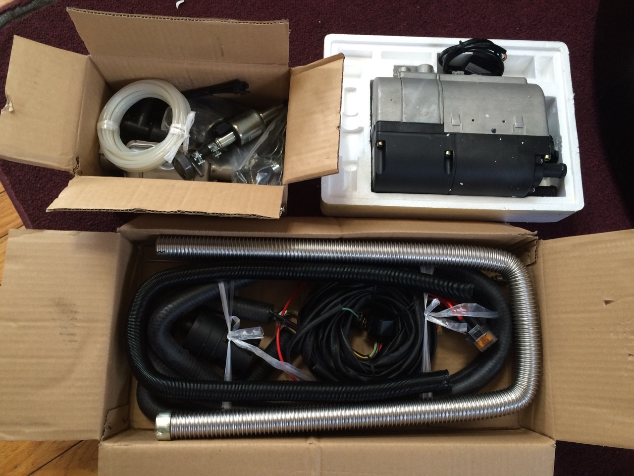 I ordered the heater a couple of weeks ago and it finally showed up the other day. Inside the box was the heater itself, radiator hose, a wire harness, and more tiny hose clamps than I care to count. I spread the items out on my living room floor to see what was there, and how it would all go together. The “Made in China” documentation was NOT particularly good, but it’s pretty obvious where the radiator hose should connect. Likewise, the wire harness isn’t hard to figure out – the four pin male connector goes to the four pin female connector, etc.