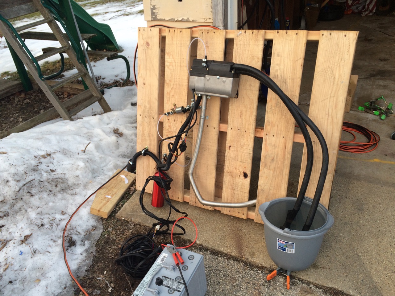 To mount the mock-up, I screwed the mounting bracket to the pallet, then set the furnace onto that. Next, I began connecting the fuel line, going from the heater to the 12V fuel pump, and finally to the temporary fuel tank. For that, I drilled a 1/8″ hole into the cap of a camping fuel bottle. The rigid fuel pickup goes through the hole and down into the bottle.