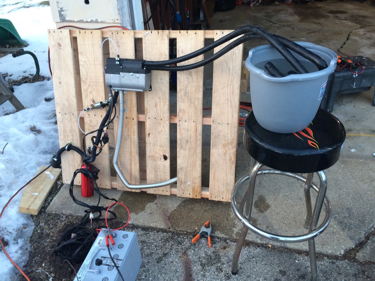 With that, the fuel-burning boiler was ready for testing. I pressed the “Heat” button on the control panel and I could hear various sounds of the heater, but mostly, I heard the shriek of the internal water pump. Many pumps are lubricated by the fluid traveling through them, and not all pumps are “self-priming”. Just turning the heater on did NOT mean that it would be powerful enough to suck water out of the bucket. I lifted the bucket up onto a stool, to make it the same height as the heater, and moments later, I could hear the water being pumped properly, which was confirmed by a sudden steady stream of water back out the other water hose.