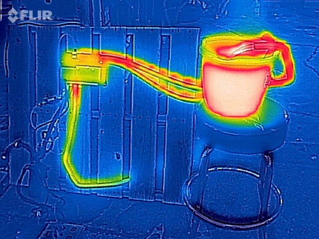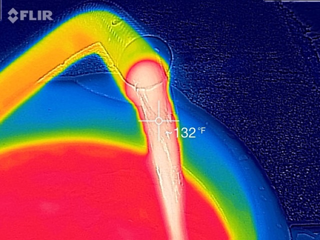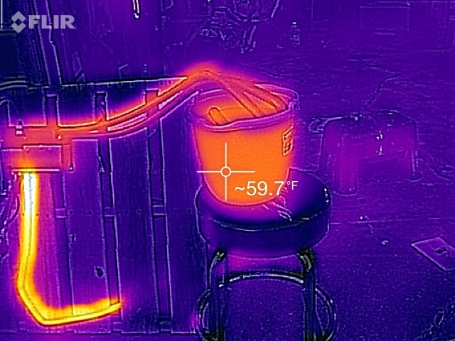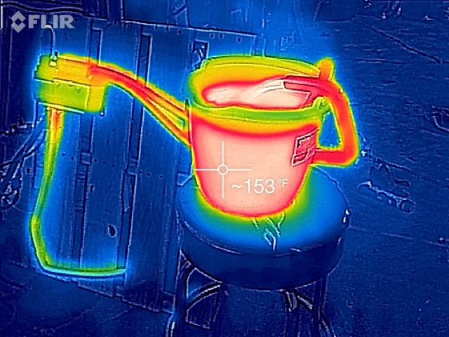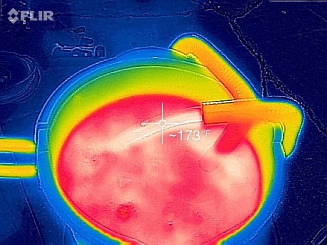 I shot some stills and motion video with my thermal camera. The exhaust pipe does get very hot, as one might expect. The water in the bucket started off at room temperature and fairly quickly heated up. It didn’t take long until there was steam rising from the top of the bucket. The rubber radiator hose is an insulator compared to the metal components. I measured water coming out of the hose at over 170 degrees F. I believe that the heater in the iMiEV tops out at 140 degrees.