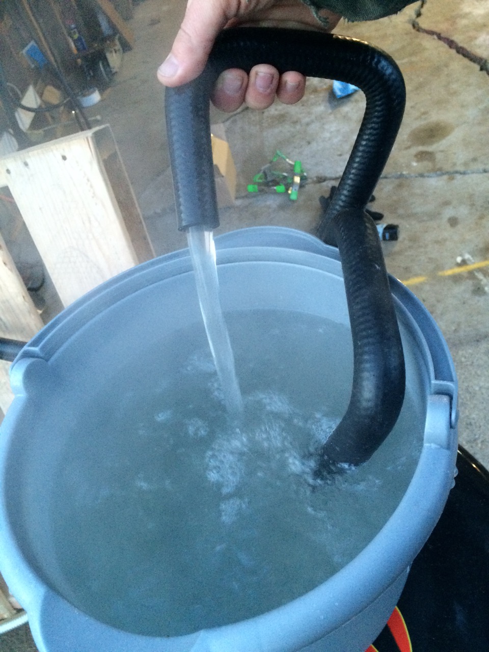 I cut the large radiator hose into two equal pieces. Those went onto the two connections on the side of the heater, one for cold water in and the other for the hot water out. I ran both hoses to a bucket of water.