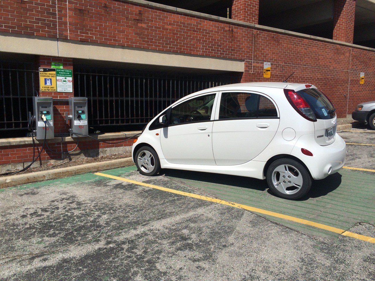 I was working in Milwaukee, Wisconsin, at a location about 37 miles from my house. The car I’m driving is a Mitsubishi iMiEV – the least expensive, most efficient*, smallest battery pack electric car in the United States. It also has an official range per charge of 62 miles. Since I drove 37 miles to work, yes, I would have to drive those same 37 miles back, for a total of 74 miles, or about 12 more miles than the car was ever designed for.