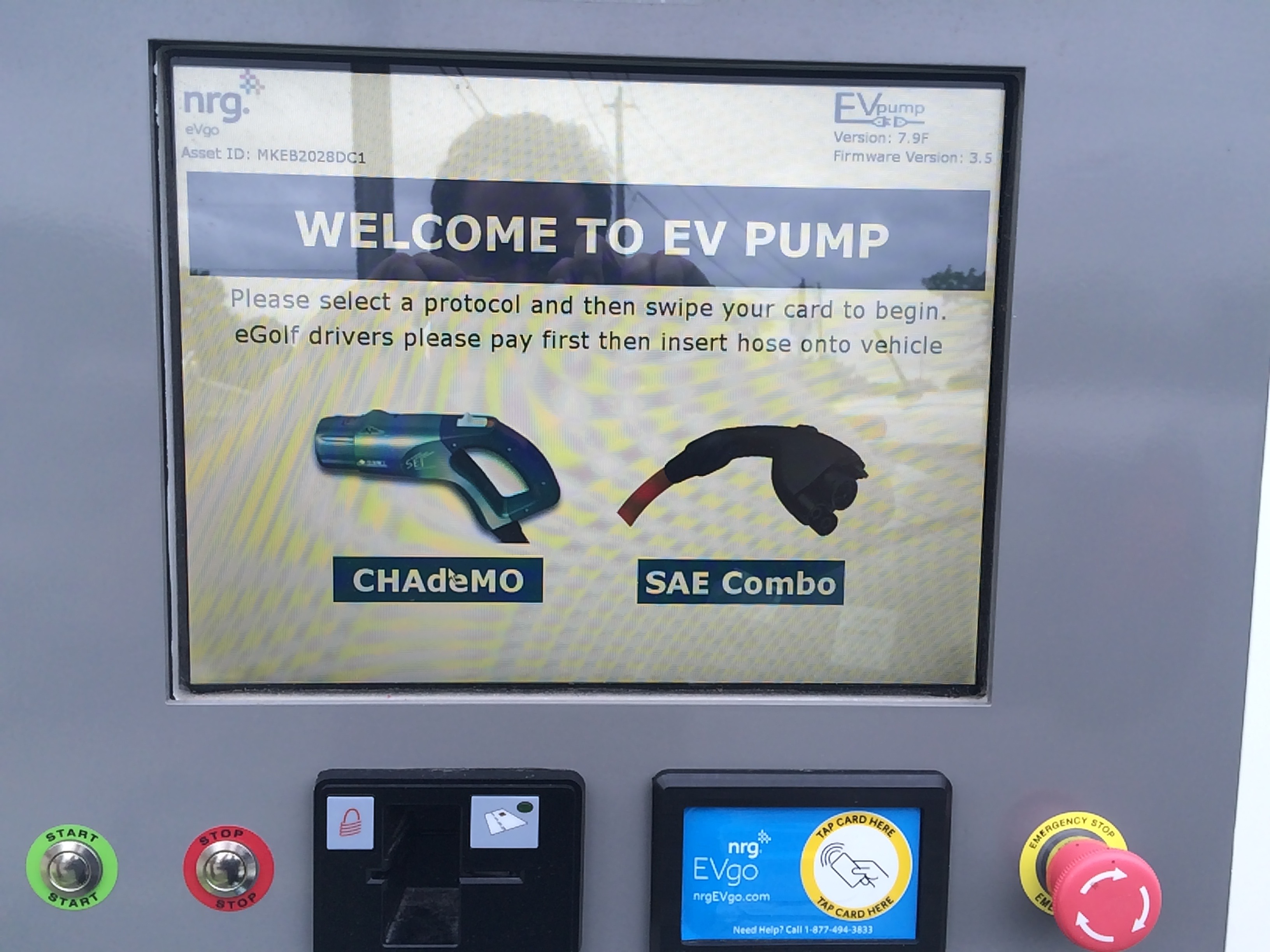 Next, I went to the touch screen on the DC Charger. The screen was bright and easy to read. It featured images of the two connectors, and invited me to pick which one I wanted to use. I selected the CHAdeMO cable and advanced to the next screen. That asked me to tap my EVGO card.