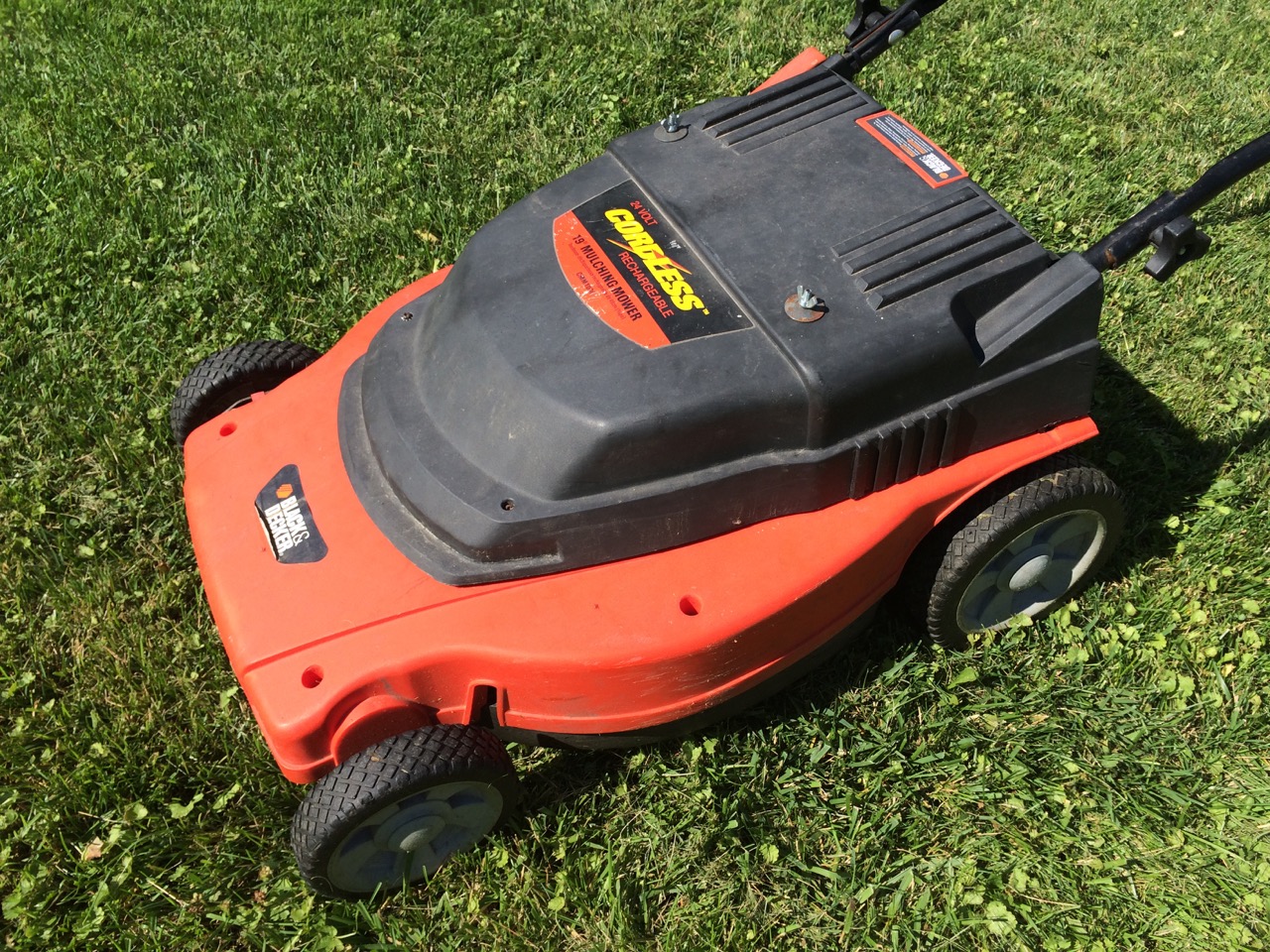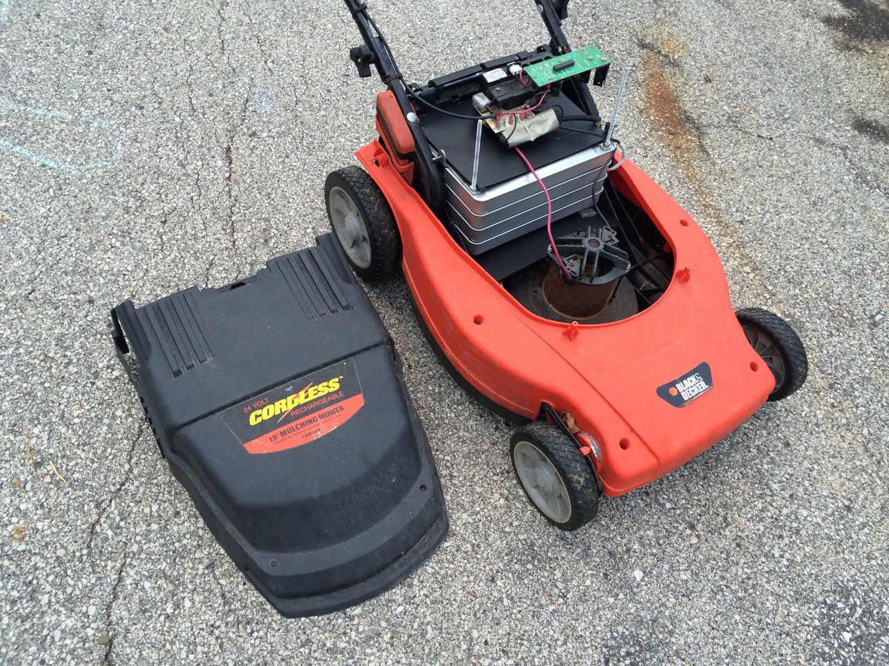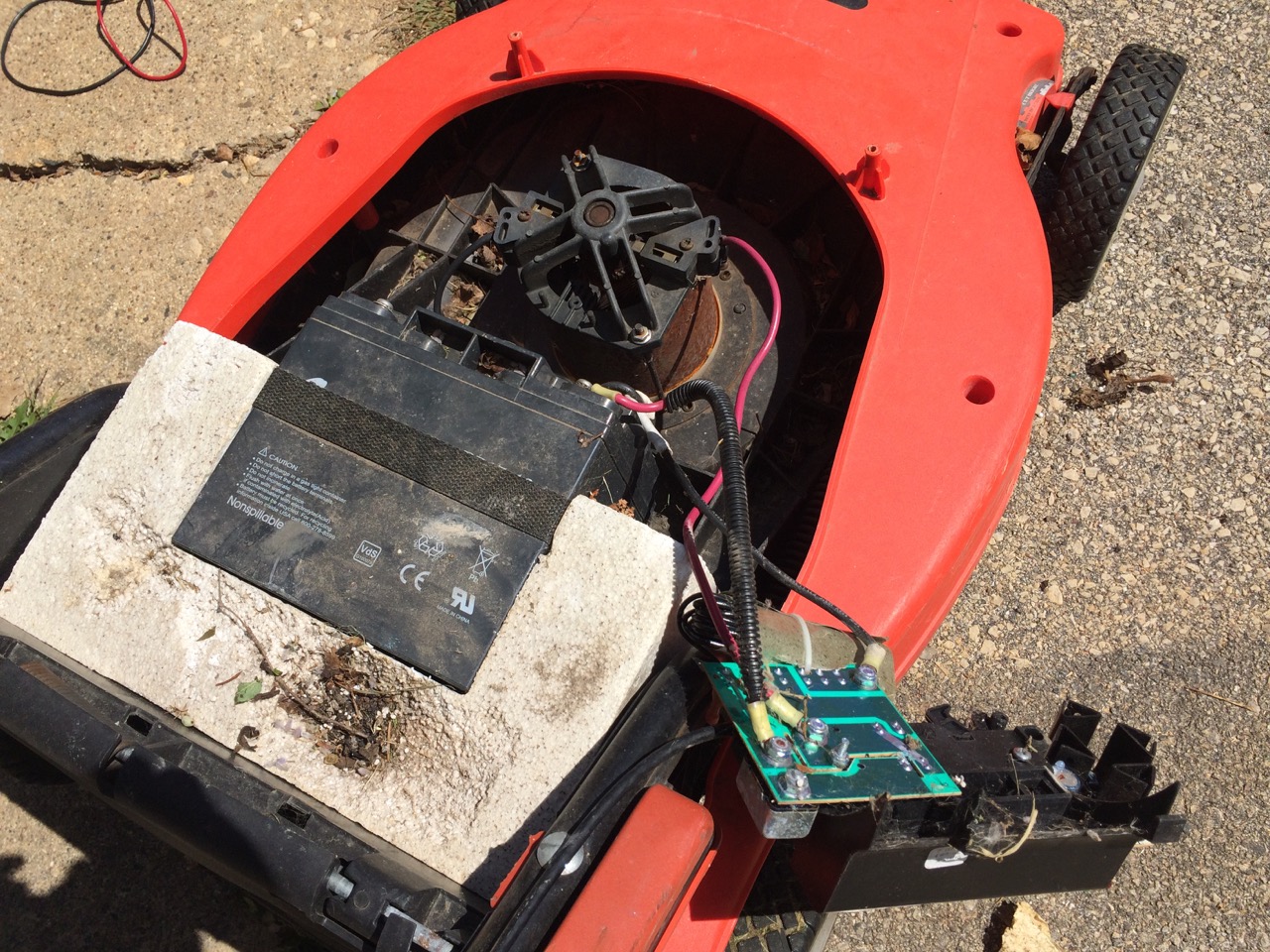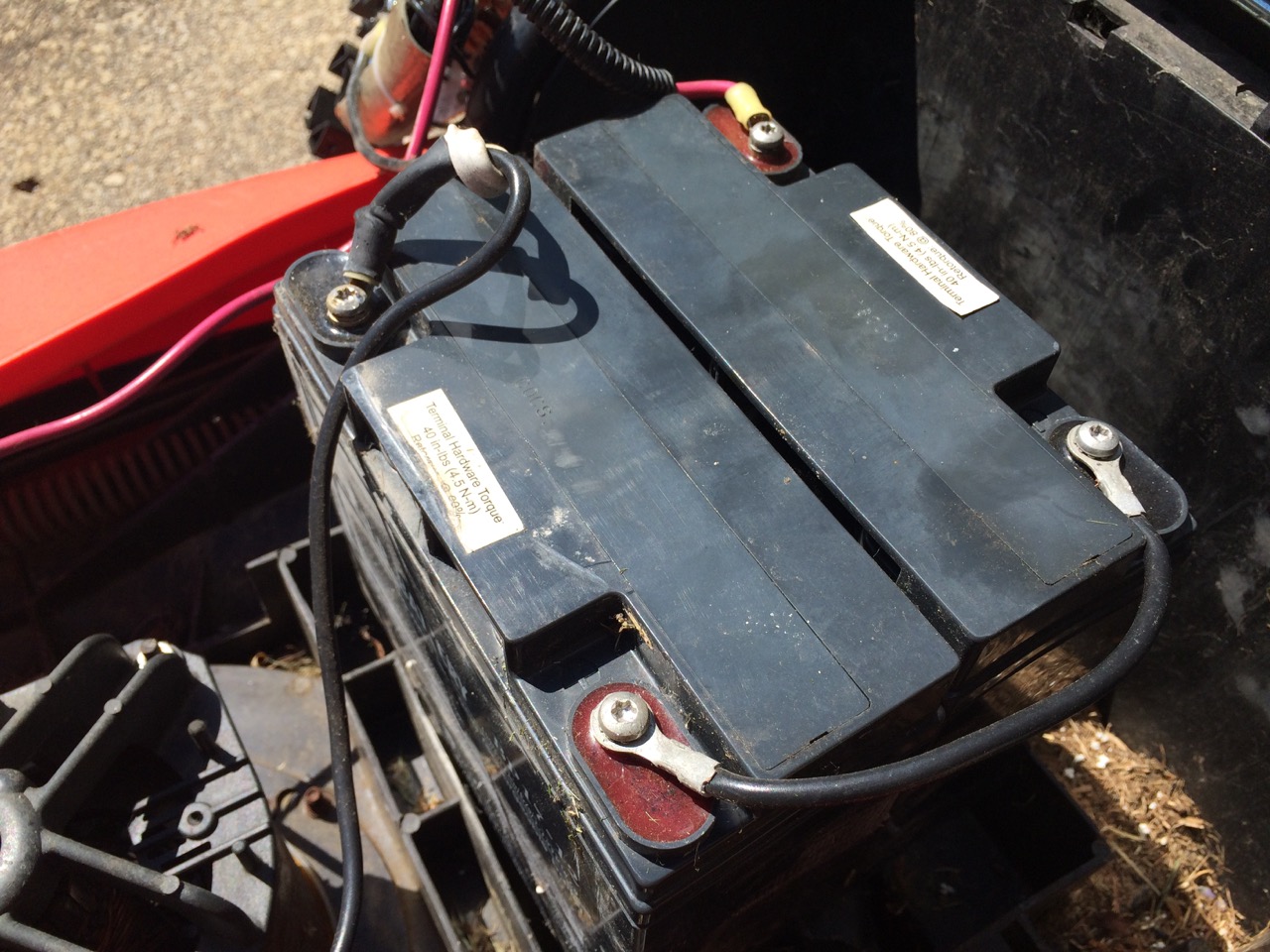 I got this mower a few years back from my friend, Rob, when he was moving. At the time, it worked pretty well, running on two 12V, 17AH sealed lead-acid batteries. The batteries have slowly been losing capacity, and the mower noticeably bogs down when pushing too fast or going through extra long grass. I checked the batteries. At the point where I could really feel the mower slowing, I stopped and checked the voltage. It was at 12.5V per battery, which should be fine, but seeing as how the voltage drops under load, it was time to replace them.