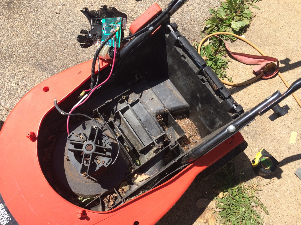 Ha! I did something similar with my Black and Decker mower which was exactly like yours except instead of leaf modules I used what I had, a pair of Turnigy 6 cell 22.2 volt 5 amp hour lithium hobby batteries in parallel. They’re good for about 10 minutes of mowing and the whole thing is so light it’s more like vacuuming. I recharge off a large, solar charged deep cycle battery.