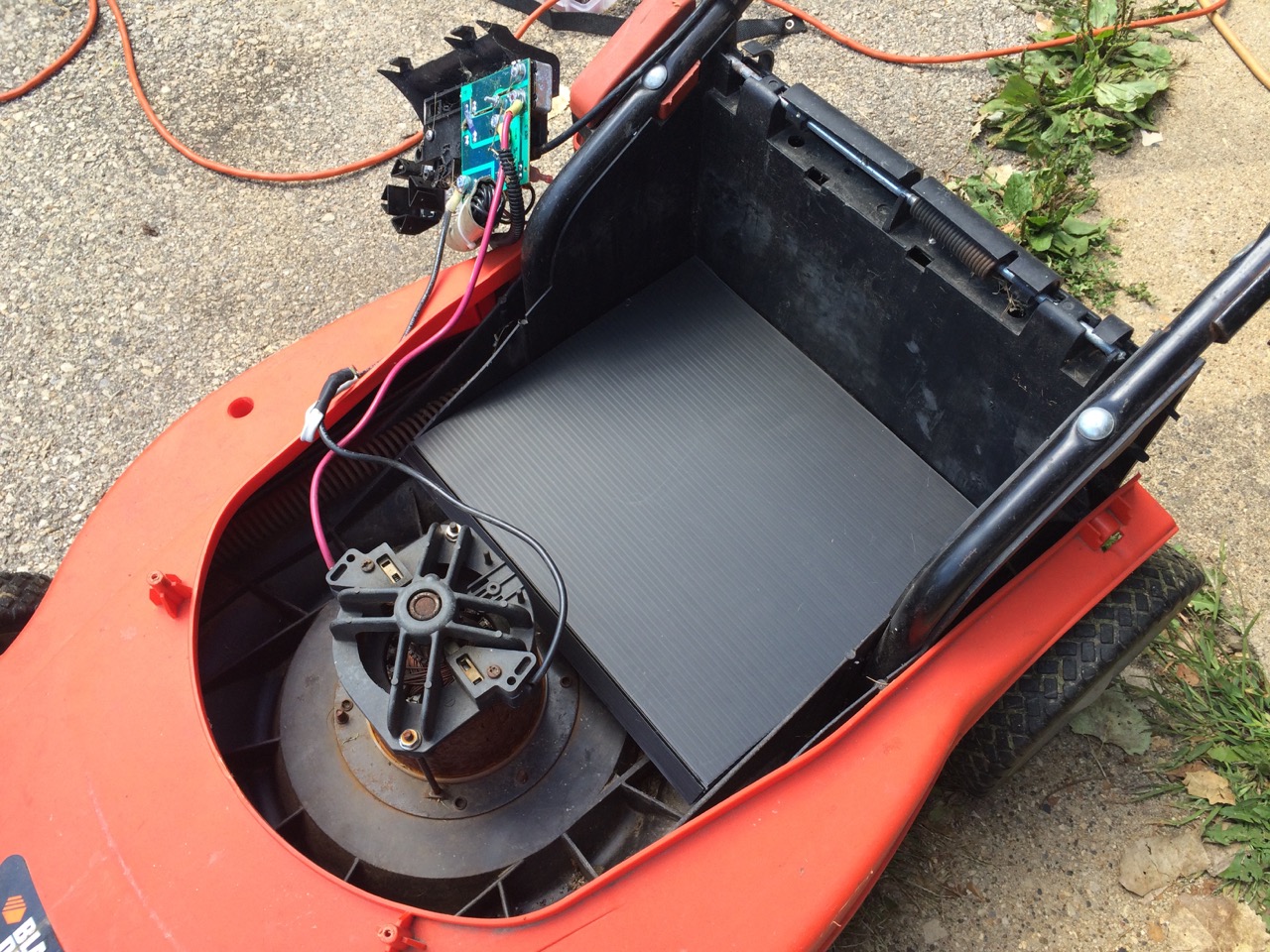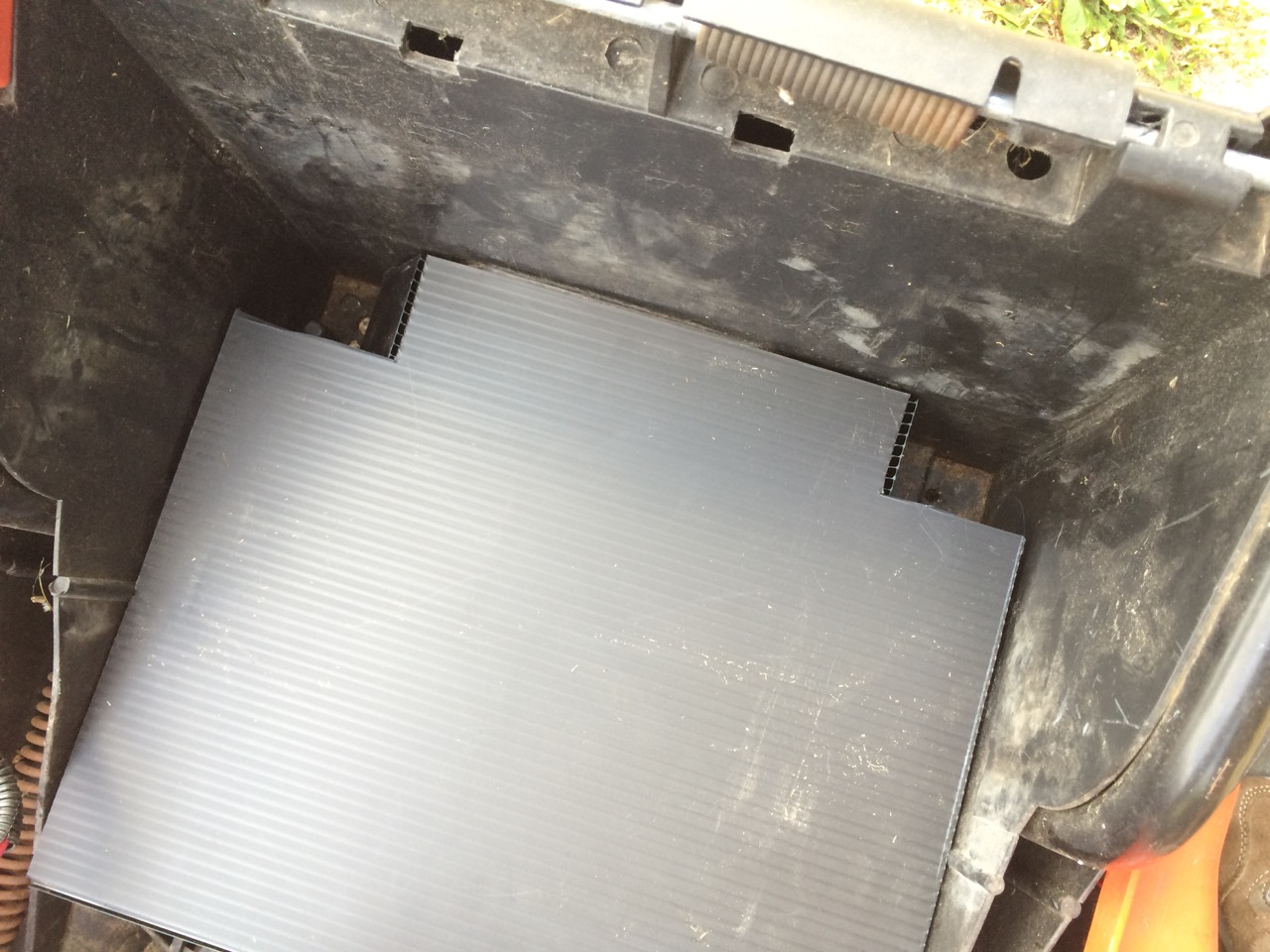 The whole bottom of the mower is plastic. While there’s plenty of structure there to hold the batteries, it’s not exactly flat or even. I cut a piece of corrugated plastic to fit the bottom of the mower. That also covered up a hole worn through the bottom of the mower, which could let cut grass in to the battery compartment. I also notched the two corners of the coroplast so that I would be able to get threaded rod down into the corners of the mower to mount down the batteries.