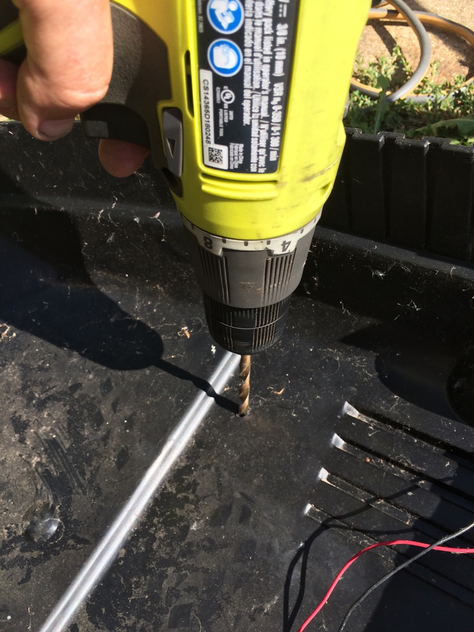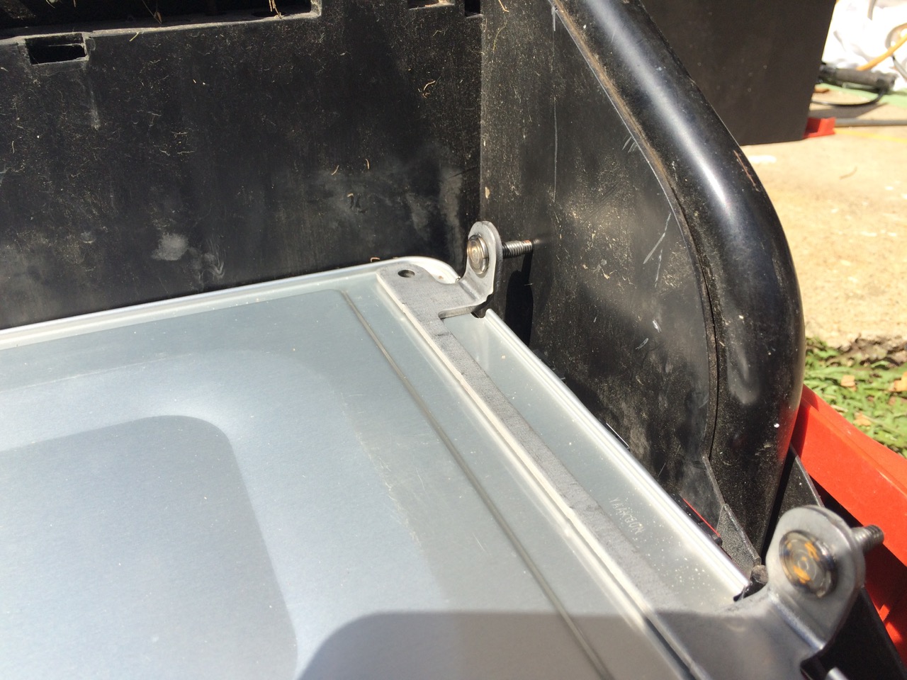 Looking at the cover I have for the mower, I realized that I might actually be able to fit the cover back on, pretty much unmodified! I set the cover in place, but it couldn’t go down all the way because of the extra threaded rod sticking up. With the cover in placed, I smacked the cover with a rubber mallet so that the threaded rod would indent on the plastic. I then pulled the cover off and drilled two 1/4″ holes through it.