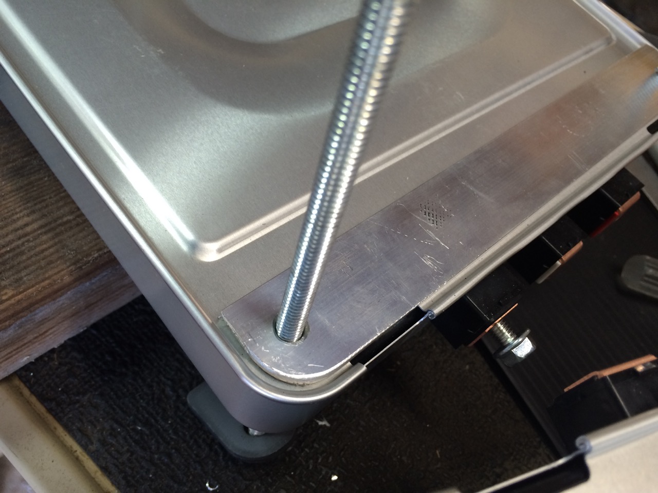 Next, I lifted the battery pack into the mower, and marked where the two threaded rods on the rear side of the mower would line up. I drilled holes in those locations, so that the threaded rod would poke through the bottom of the mower to be bolted into place. I also weighed the battery pack, as I had my new battery pack, the original battery pack, and my bathroom garage scale handy. The original battery (2x17AH 12V) weighed in at about 33 lbs. The new battery weighed 38 lbs. 5 pounds heavier! Yipes! I thought lithium was supposed to be lighter! Well, it is for the same capacity. The Nissan Leaf cell modules are rated at 60A, and I needed at least 3 of them to get to the appropriate 24V range of the mower. I had four, so I figured that would give me around 30V and higher capacity. The trade off is that the mower gained a few pounds.