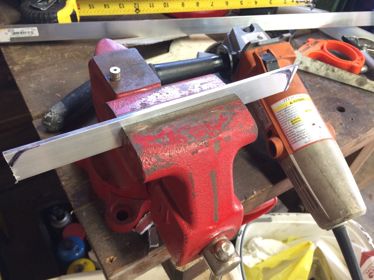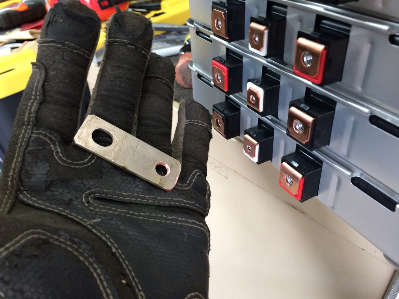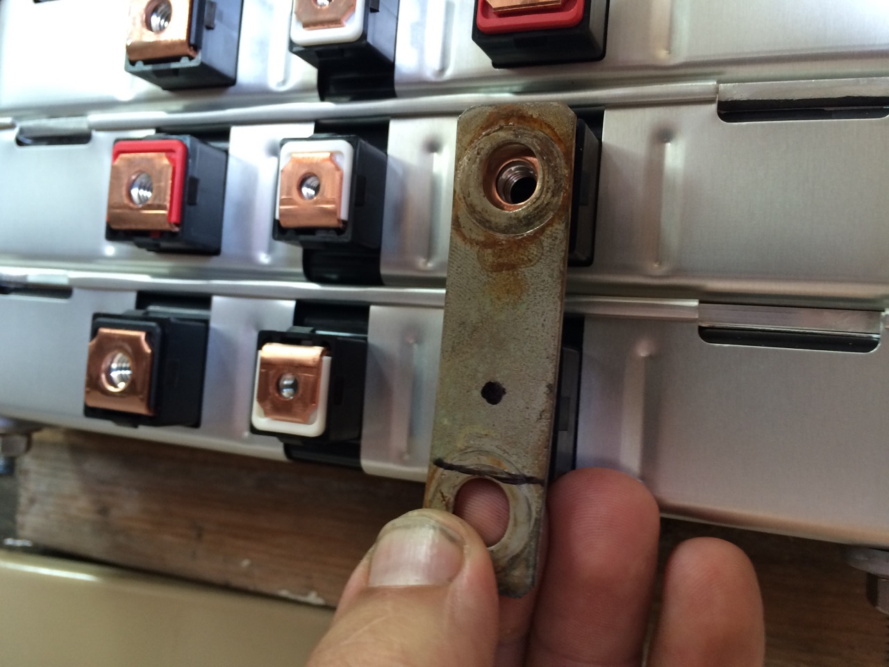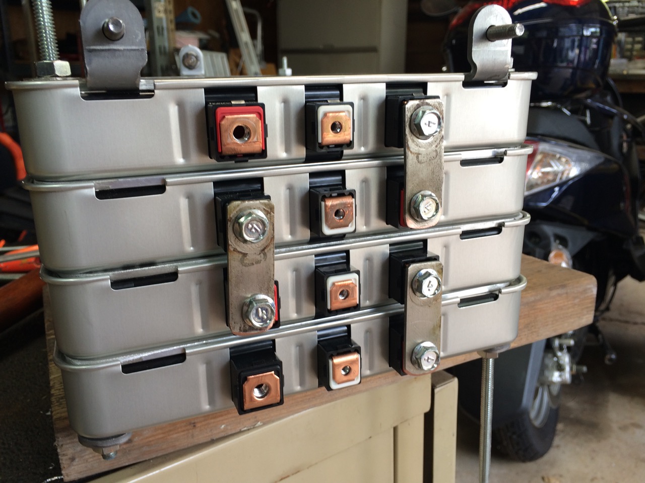 Since the cells were now physically bolted together, I could add the bus bars. I had a few kicking around, but they were too long. (I believe these were from the salvaged Mitsubishi iMiEV battery pack.) I put a bus bar into my vise, cut off the extra length with the angle-grinder, and drilled a new 1/4″ hole. After testing to make sure the new bus bar was right, I made two more of them the same way, then put them on the battery pack and hand-tightened them down. Tightening screws into battery terminals is one place where you don’t want to use an impact wrench!