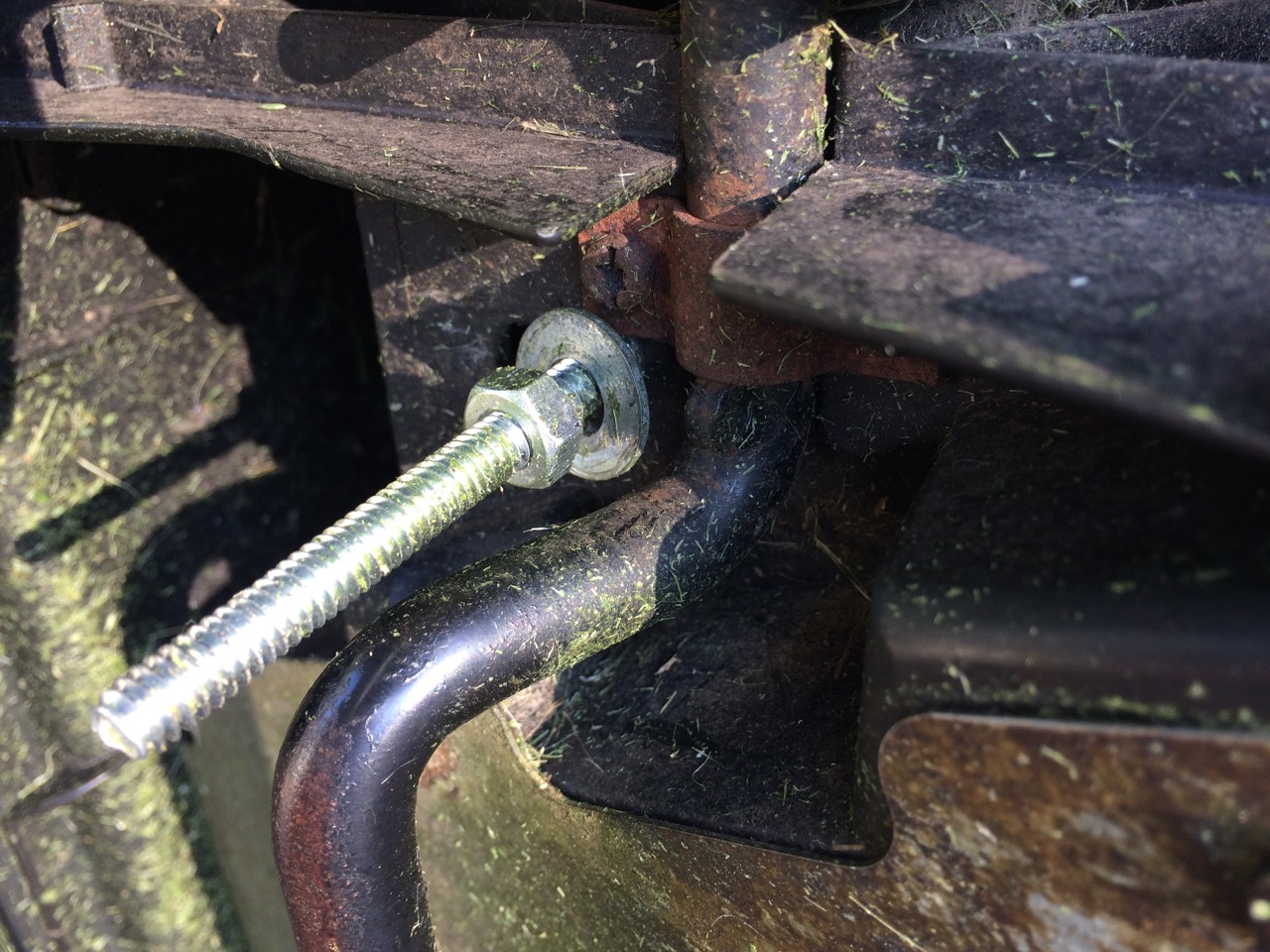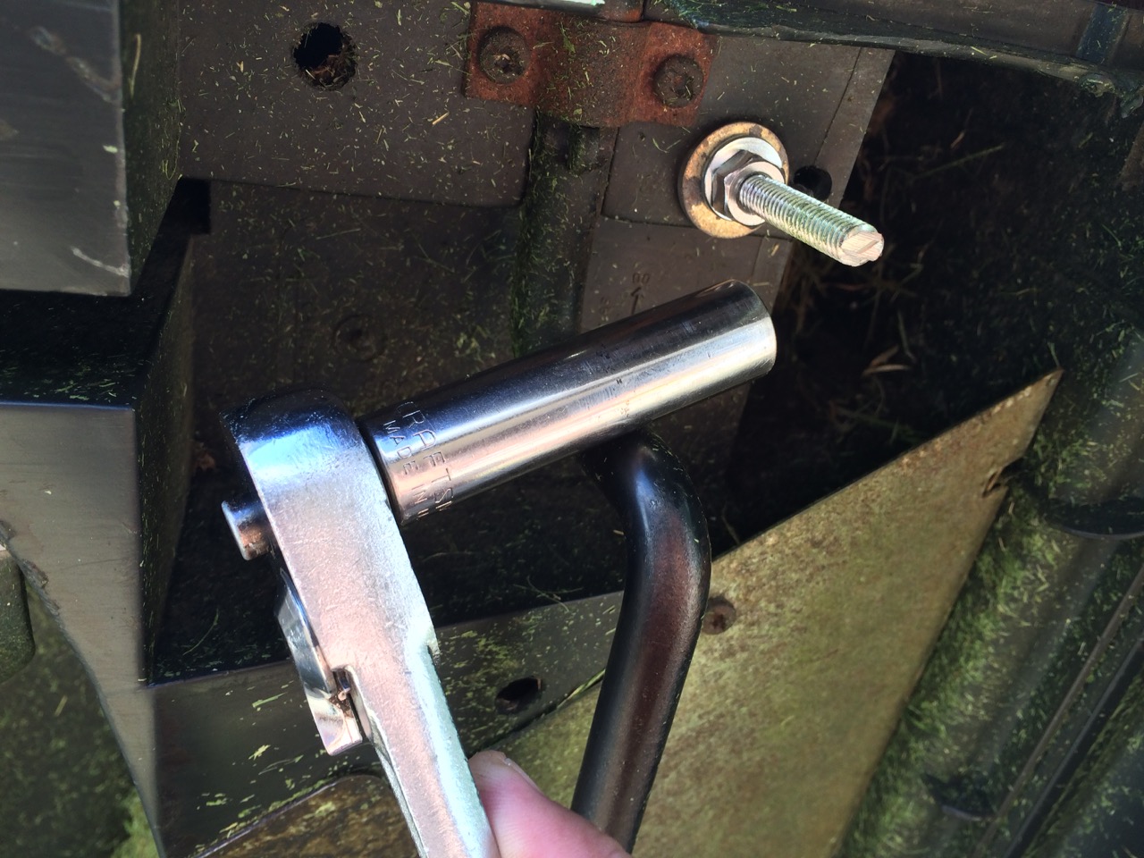 At that point, I flipped the mower up on the side and put on washers, lock washers, and nuts. I realized that the extra threaded rod was longer than my deep sockets, and had to trim down the rod by a few inches. The cut off disc on my angle grinder made quick work of it. I tightened down the nuts on the threaded rod and could feel the battery pack pull down into the mower.