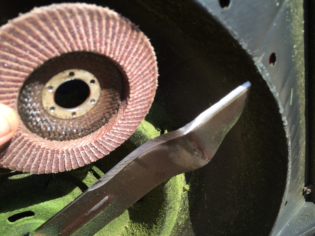 With the mower on its side, I also used a “flapper disc” to touch up the blade. A sharp mower doesn’t just cut better, it’s also more efficient and draws less current than the battery.
