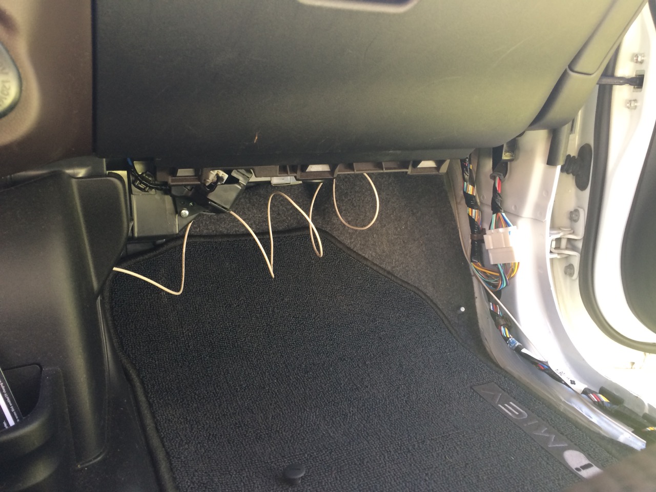 I continued to bring the wire up under the passenger side of the dashboard. I have previously installed a “parking heater” on this car, and I needed to pass some wiring through the fire-wall. I did that at a penetration that’s on the floor right behind the center console, just below the HVAC controls. I reused this location by passing my wire though it.
