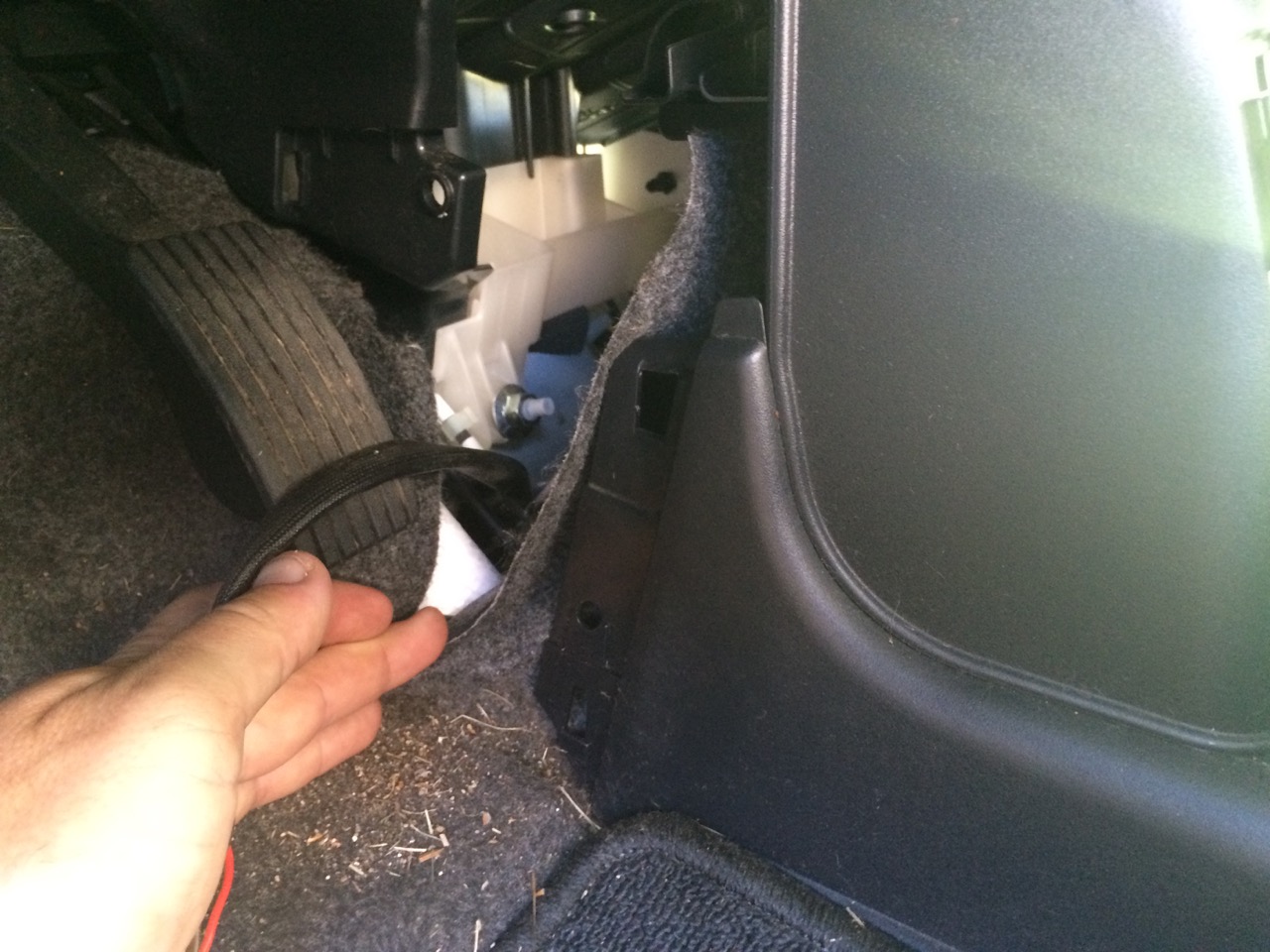 The Curt powered converter requires 12V+ power of up to 10 amps. That means I needed to run a wire all the way to the front of the vehicle, through a fuse, and straight to the battery. I unrolled some 14 ga stranded wire, with a white jacket (which is also what I used to get the left turn signal to the right side.) I ran the wire from the back of the vehicle to the front, making sure I would have plenty of length. I removed the various lower interior plastic body panels, and ran this wire along side the existing wire harness in the car. I found that on the passenger side “B-Pillar” that I would have had to uninstall the seat belt to remove the panel. Instead, I simply removed the panels on either side, and fished the wire through.