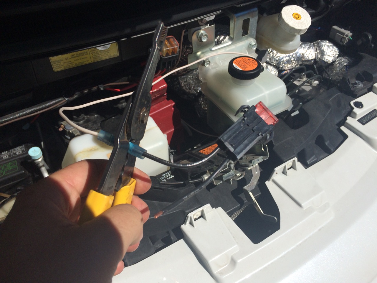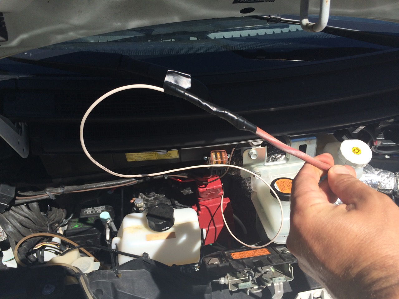 Next, from outside the front of the car, I ran a heavy piece of wire from near the battery, down through the maze of pipes and wires under the hood to my white wire, so that I could fish it back up. It’s much easier to try to pull a wire up and out than to try to push it!