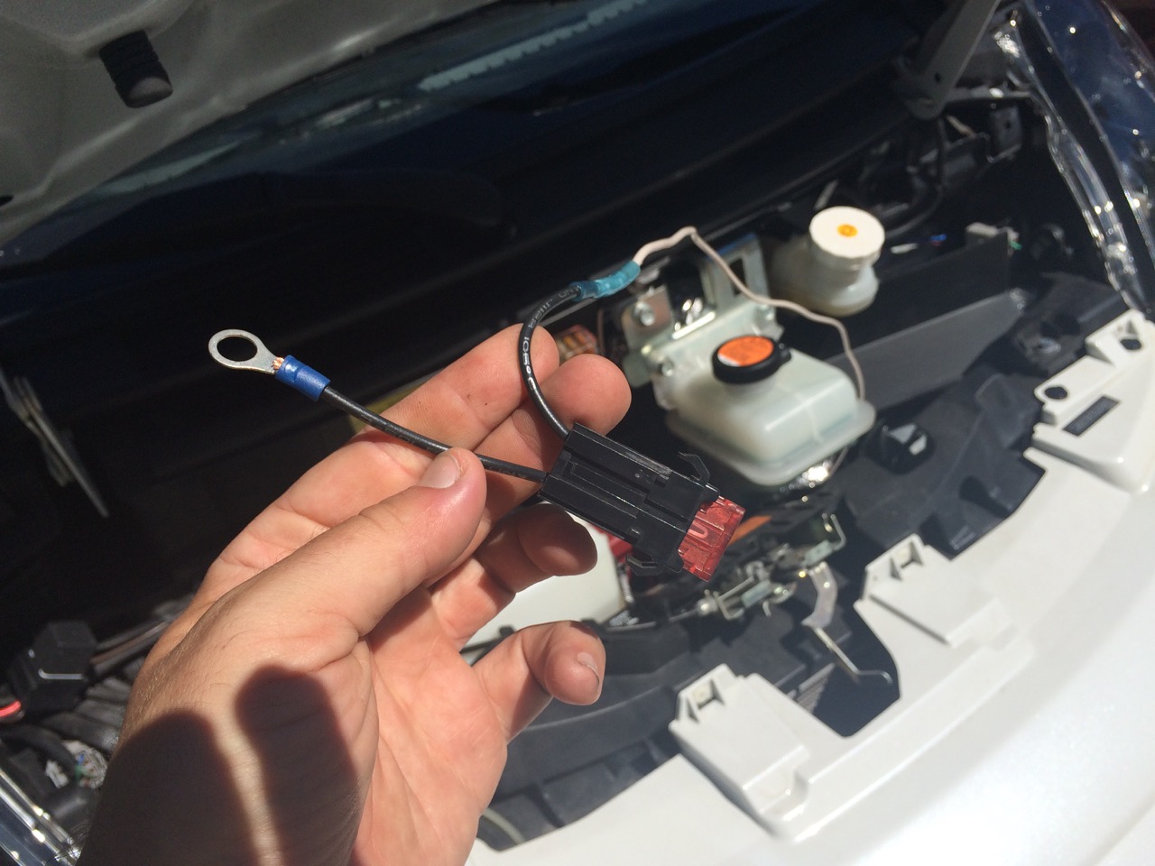 Next, I crimped on a solderless wire connector butt-splice from the wire to a dedicated automotive fuse holder. On the other end of the fuse holder, I crimped on a ring terminal of an appropriate size to go to my battery.